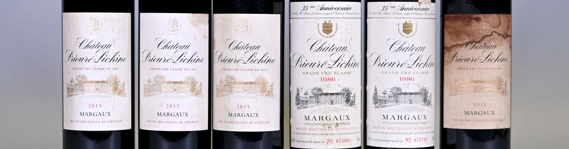 BORDEAUX – 6 bouteilles, Margaux, Château Prieuré-Lichine, 4ème Grand Cru Classé, 1986 (2) et 2015 (4). Cinq étiquettes légèrement sales dont deux présentent quelques points de décollement et une étiquette est sale et tachée.