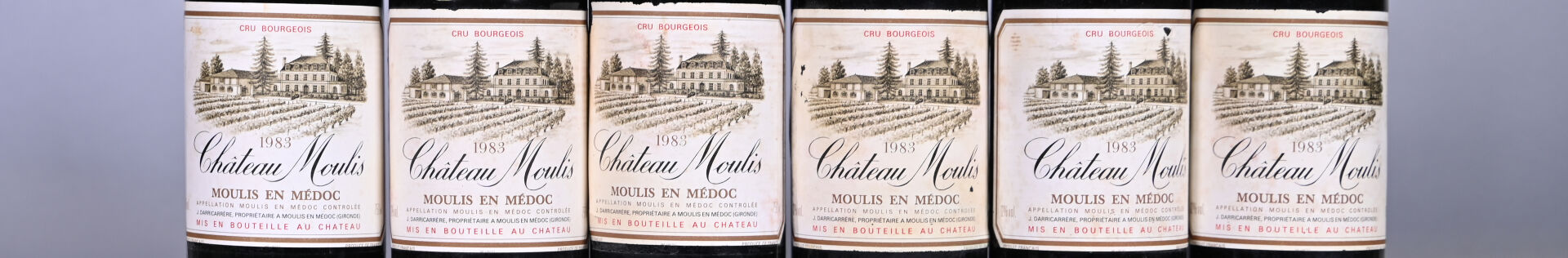 BORDEAUX – 6 bouteilles, Moulis, Château Moulis, Cru Bourgeois, 1983. En caisse bois. 3 BG (+) et 1 TLB (+). Etiquettes légèrement sales dont trois sont partiellement décollées et trois entièrement décollées.