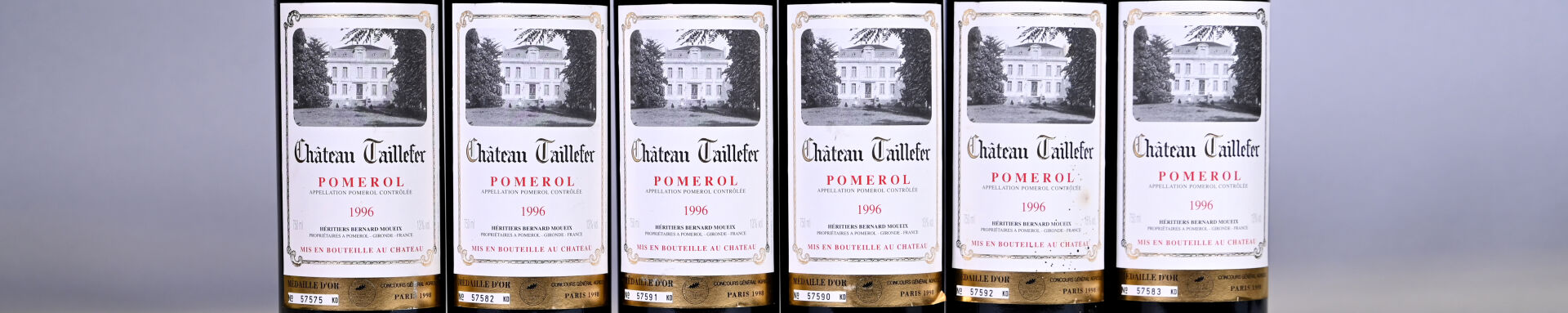 BORDEAUX – 6 bouteilles, Pomerol, Château Taillefer, 1996. Une capsule légèrement sale. Une étiquette légèrement sale avec de petites taches.