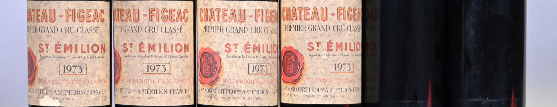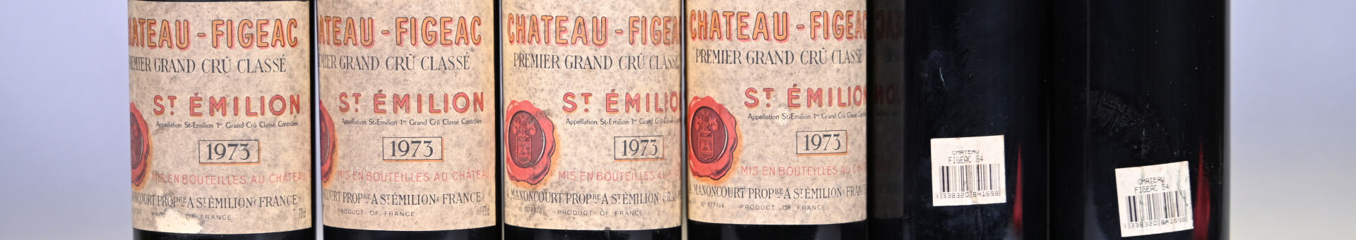 BORDEAUX – 6 bouteilles, Saint-Emilion Grand Cru, Château Figeac, 1973 (4) et probablement 1984 (2). Bouchons très légèrement engagés. 2 HE (+), 2 HE, 1 HE (-) et 1 ME (1984). Capsules sales à très sales, déformées en leur sommet et dont une présente une petite déchirure en son sommet. Quatre étiquettes sont sales et deux sont manquantes.