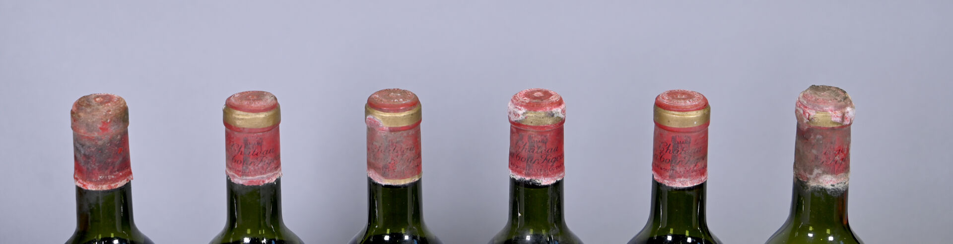 BORDEAUX – 6 bouteilles, Saint-Emilion Grand Cru, Château La Tour Figeac, 1959 (5) et millésime ? (1). 1 HE, 2 HE (-), 2 ME (+) et 1 BE. Capsules très sales, abimées et déformées en leur sommet. Etiquettes très sales, difficilement lisibles dont une est très légèrement et dont cinq sont dégradées avec des déchirures et des manques.