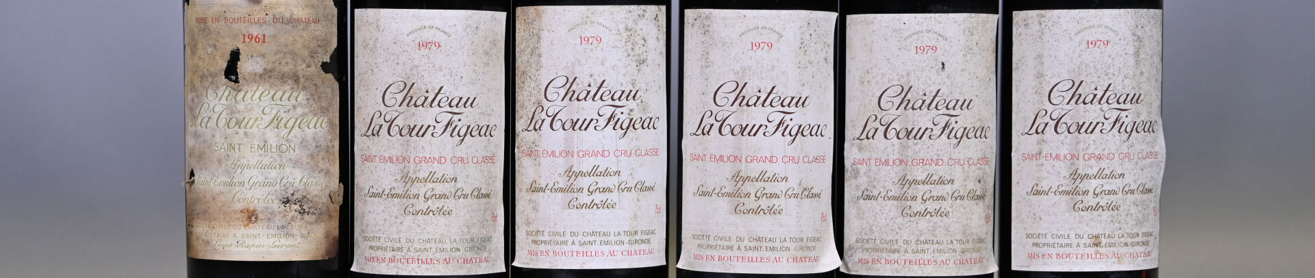 BORDEAUX – 6 bouteilles, Saint-Emilion Grand Cru, Château La Tour Figeac, 1961 (1) et 1979 (5). 2 TLB (-), 3 HE et 1 ME (1961). Capsules légèrement sales à sales. Etiquettes sales avec des points de décollement ou partiellement décollées et dont une est abimée (1961).