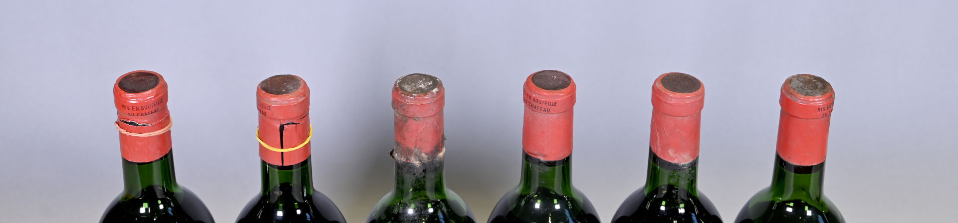 BORDEAUX – 6 bouteilles, Saint-Emilion Grand Cru, Château Pavie, 1er Grand Cru Classé A, 1964 (dont une bouteille, supposée de ce millésime, 196? indiqué sur le bouchon et une autre bouteille dont le millésime est lisible sur le bouchon). 1 TLB, 2 TLB (-), 1 HE (+), 1 HE et 1 ME (-). Capsules légèrement sales et légèrement incurvées à incurvées et dont deux ont été incisées pour les besoins de l’expertise. Quatre étiquettes sales et deux étiquettes manquantes.