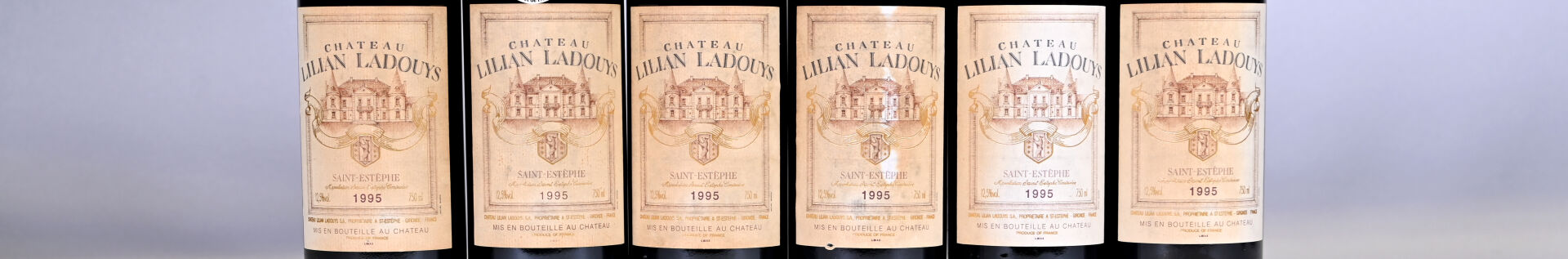 BORDEAUX – 6 bouteilles, Saint-Estèphe, Château Lilian Ladouys, 1995. 3 BG (+) et 3 BG. Etiquettes fanées et tachées.
