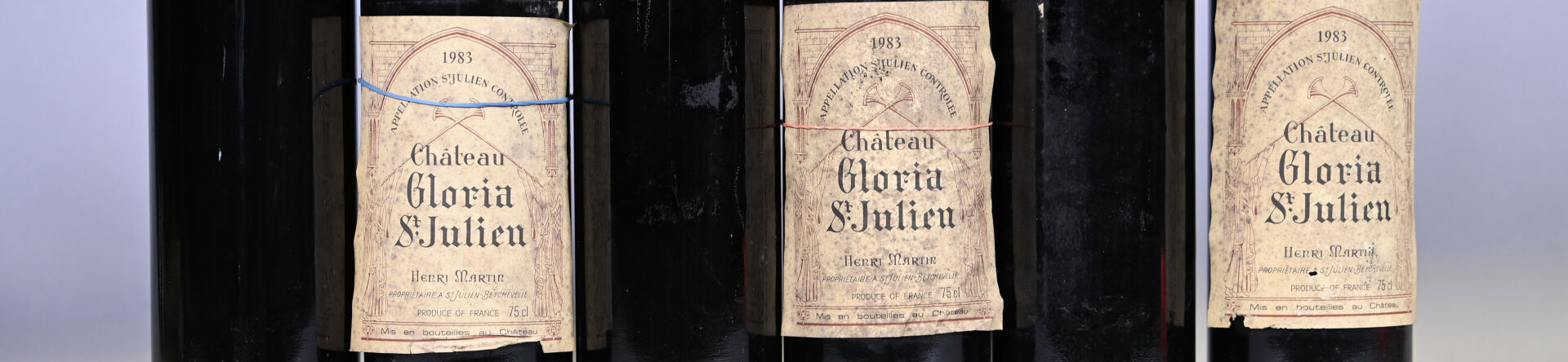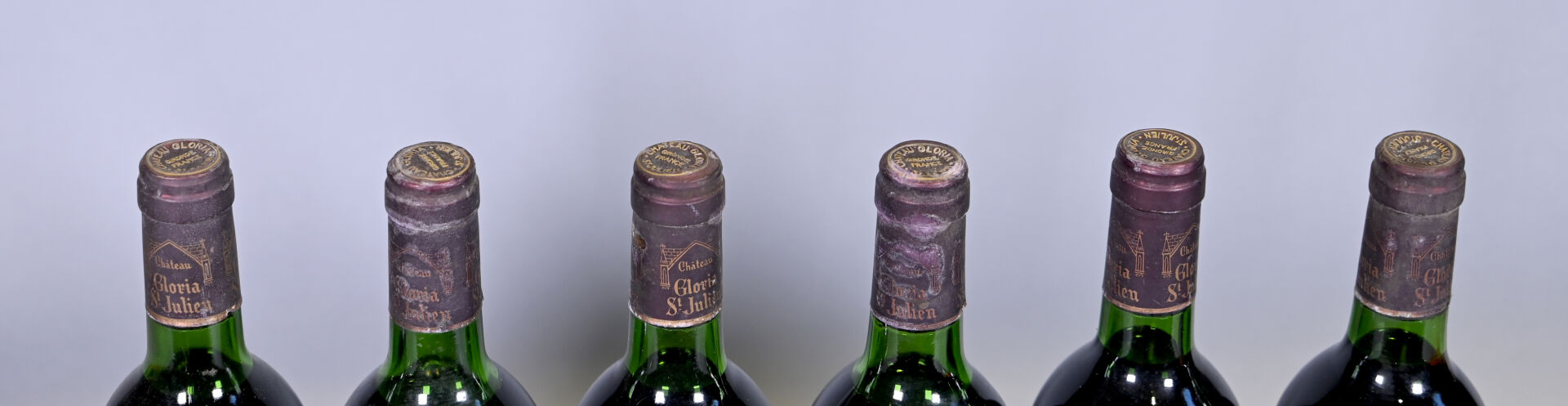 BORDEAUX – 6 bouteilles, Saint-Julien, Château Gloria, 1983 (dont 3 bouteilles sont supposées de ce millésime). Deux étiquettes entièrement décollées et une partiellement. 1 BG (+), 1 BG, 1 BG (-), 1 TLB (+) et 2 TLB. Capsules légèrement sales à sales et légèrement abimées. Etiquettes sales, légèrement abimées dont une est partiellement décollée, deux entièrement décollées et dont trois sont manquantes.