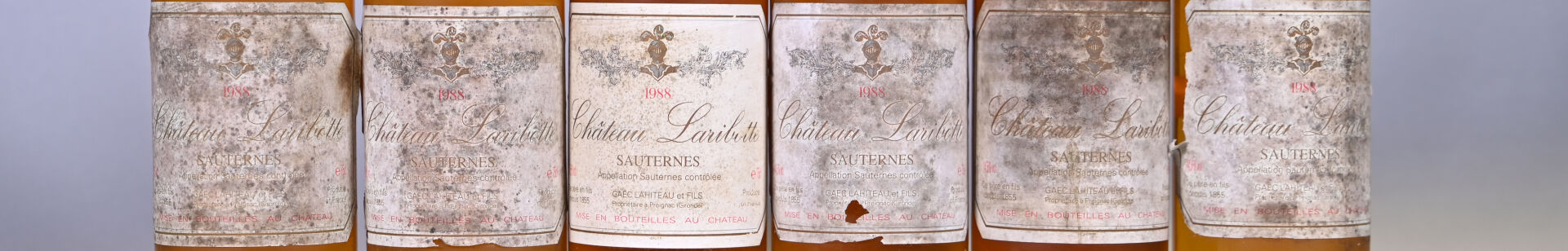 BORDEAUX – 6 bouteilles, Sauternes, Château Laribotte, 1988. 4 BG (+) et 2 BG (-). Capsules légèrement sales à sales. Etiquettes sales dont trois sont légèrement abimées à abimées.