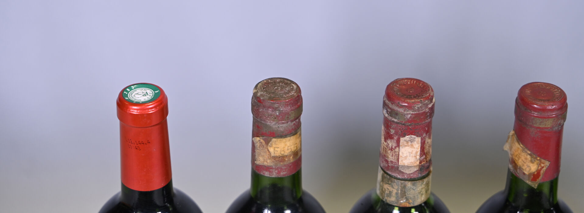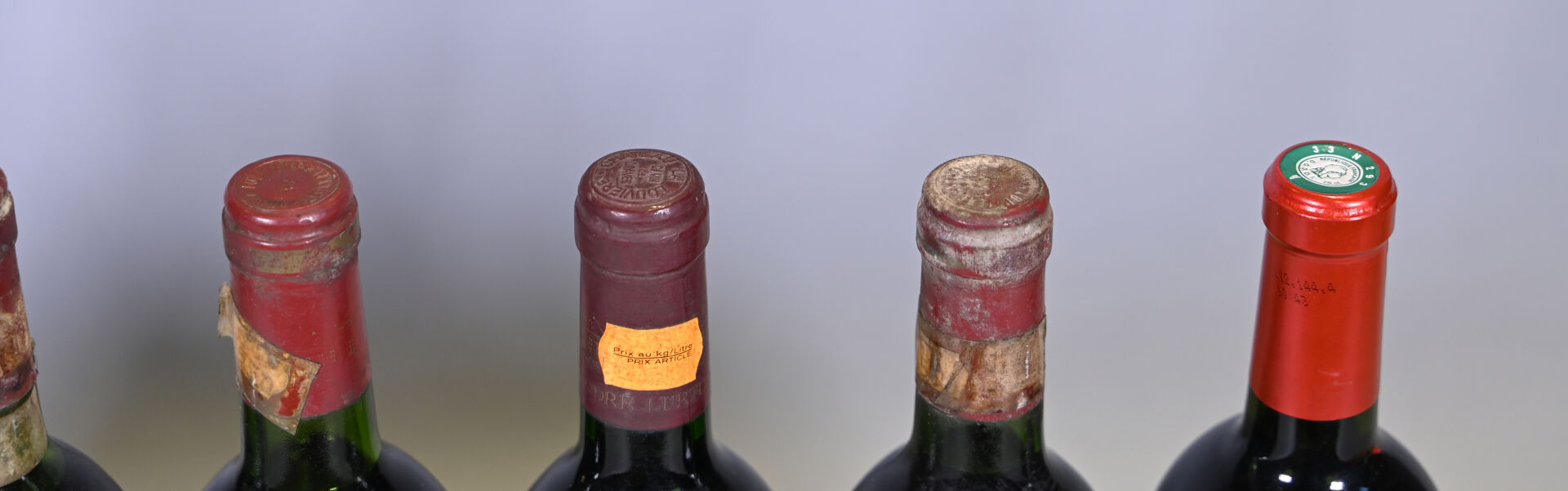 BORDEAUX – 7 bouteilles, Graves / Pessac-Léognan, Château La Louvière, 1983 (4), 1988 (1) et 2010 (2). 1 BG (+), 1 BG, 1 BG (-), 1 TLB (+) et 1 HE (+). Deux capsules légèrement sales et deux capsules sales. Cinq étiquettes légèrement sales à sales dont deux sont dégradées à très dégradées.