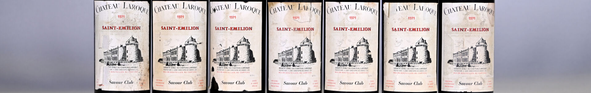 BORDEAUX – 7 bouteilles, Saint-Emilion, Château Laroque, Savour Club, 1971. Un bouchon légèrement engagé. Capsules légèrement sales et incurvées. Etiquettes sales et abimées.