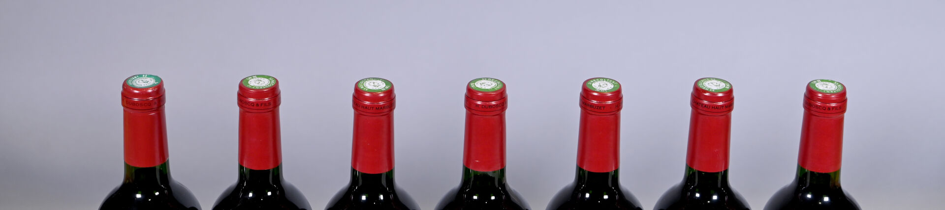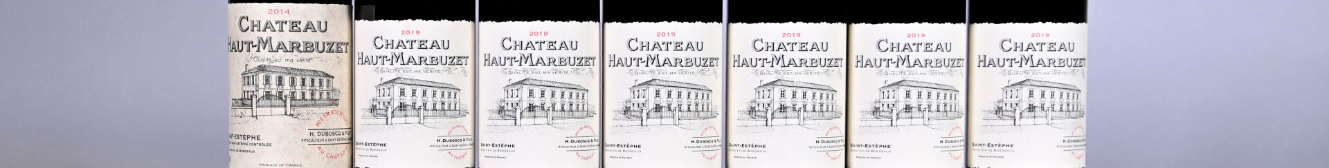 BORDEAUX – 7 bouteilles, Saint-Estèphe, Château Haut-Marbuzet, 2014 (1) et 2019 (6). Une étiquette légèrement sale avec des traces d’humidité (2014).