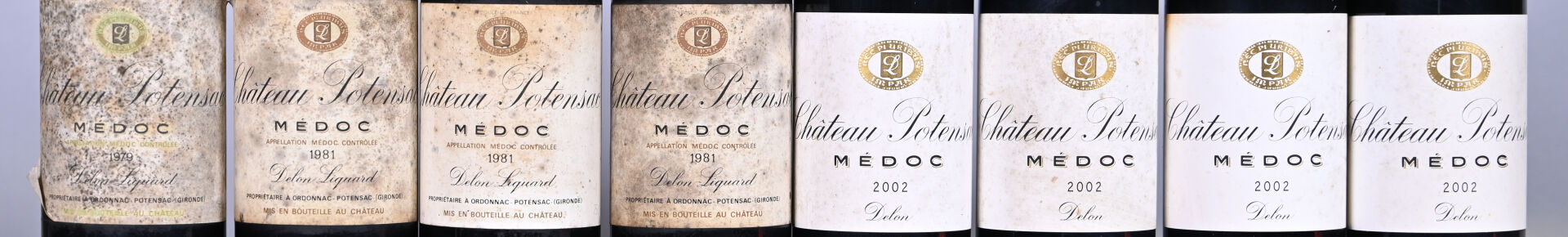 BORDEAUX – 8 bouteilles, Médoc, Château Potensac, 1981 (4) et 2002 (4). 1 BG (+), 2 BG et 1 HE. Trois capsules légèrement incurvées. Etiquettes légèrement sales à sales dont deux présentent des points de décollement. Contre-étiquettes légèrement sales.