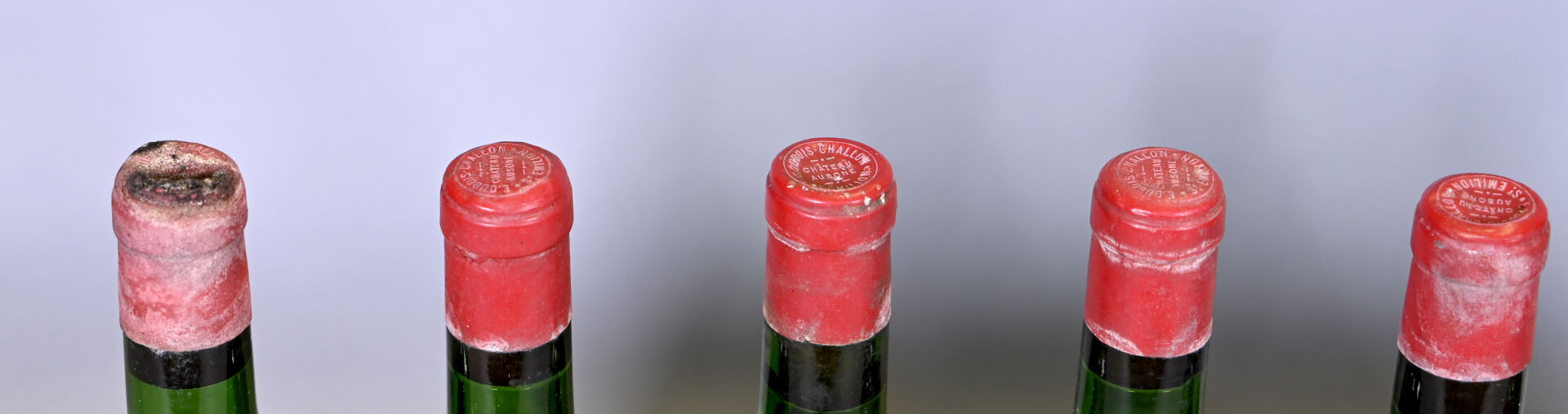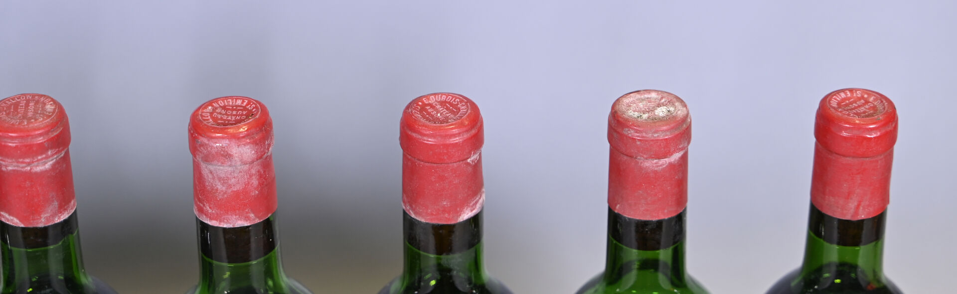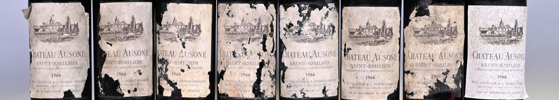 BORDEAUX – 8 bouteilles, Saint-Emilion Grand Cru, Château Ausone, 1966. Bouchons légèrement engagés. 1 TLB, 2 TLB (-), 2 HE (+), 1 ME (+), 2 BE (-) / Vidange. Cinq capsules légèrement incurvées.