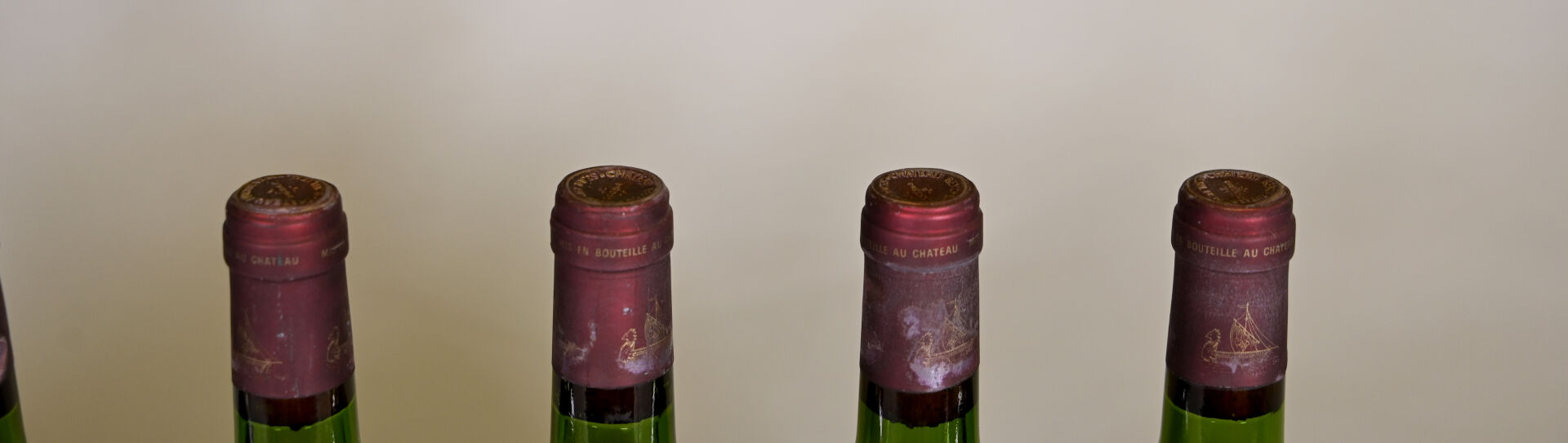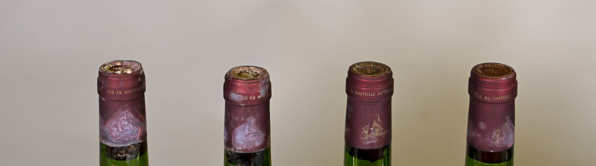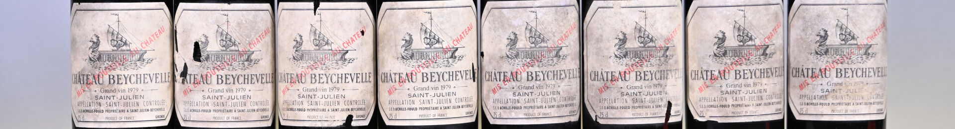 BORDEAUX – 8 bouteilles, Saint-Julien, Château Beychevelle, 4ème Grand Cru Classé, 1979. Bouchons légèrement engagés à engagés. 1 TLB (+), 1 TLB, 2 TLB (-), 2 HE (+), 1 ME (+) et 1 ME. Capsules sales, tachées, déformées en leur sommet et dont six sont incurvées. Etiquettes légèrement sales à sales et légèrement abimées à abimées.