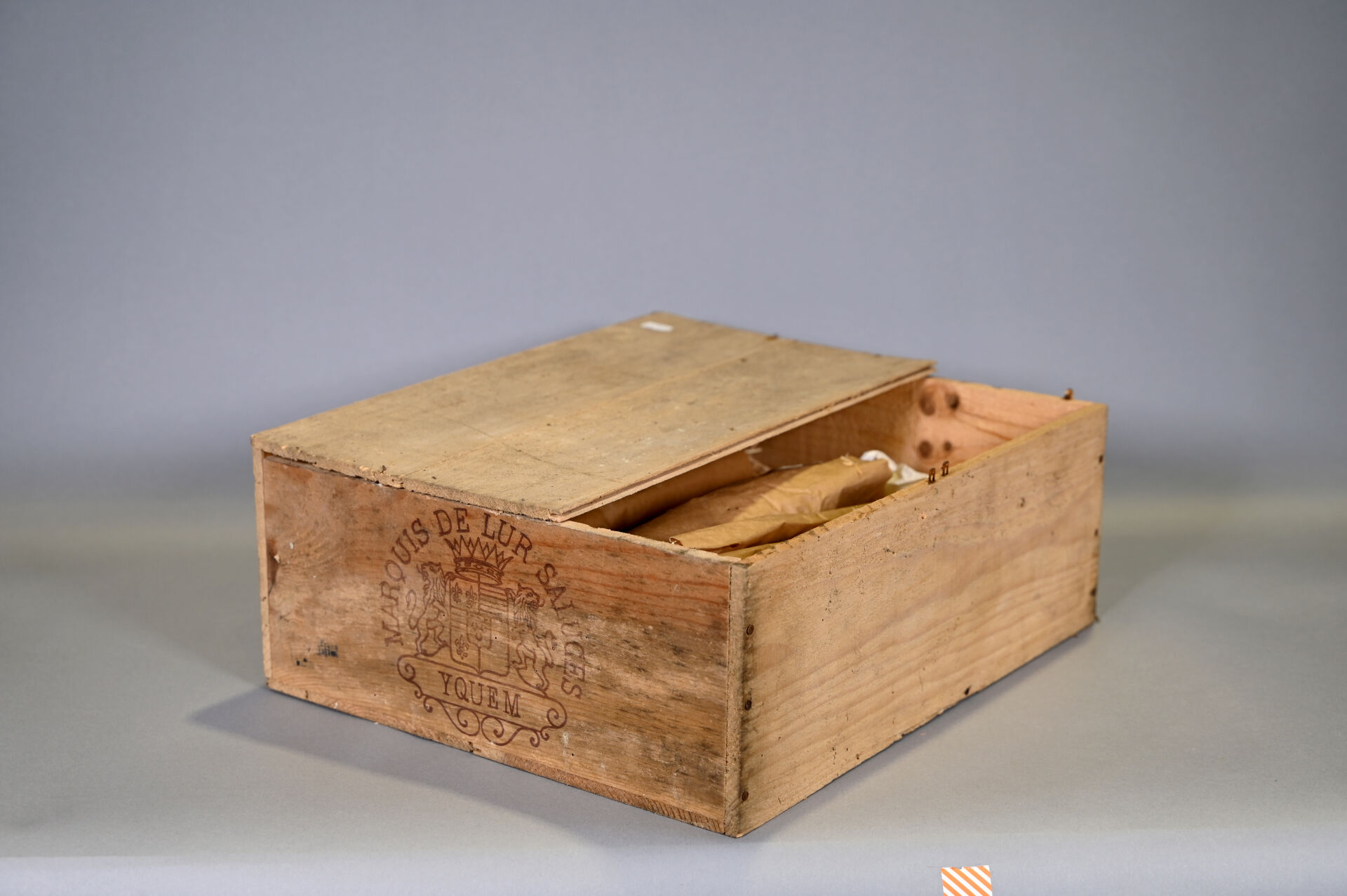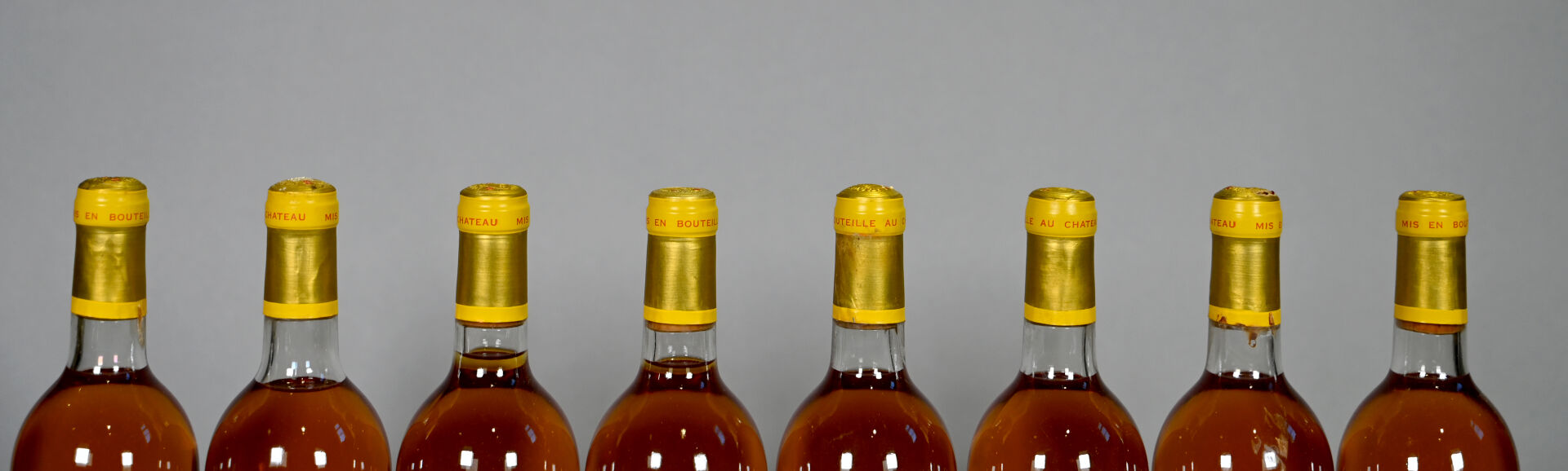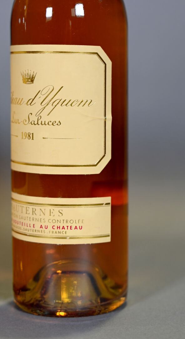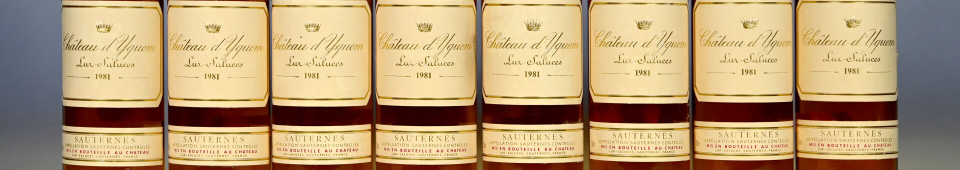 BORDEAUX – 8 bouteilles, Sauternes, Château d’Yquem, 1er Grand Cru Classé Supérieur, 1981. En caisse bois. Une bouteille couleuse. 4 BG, 1 BG (-) et 1 TLB (+). Capsules légèrement sales et déformées en leur sommet. Une étiquette très légèrement sale et un autre avec un petit point de décollement.