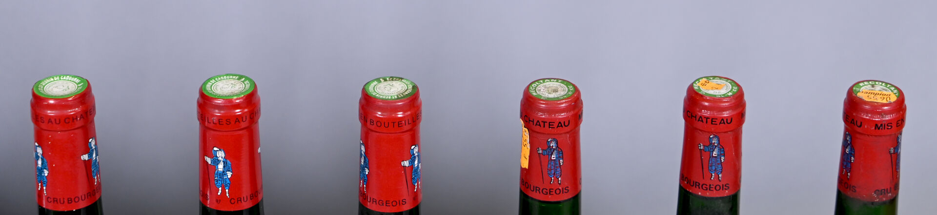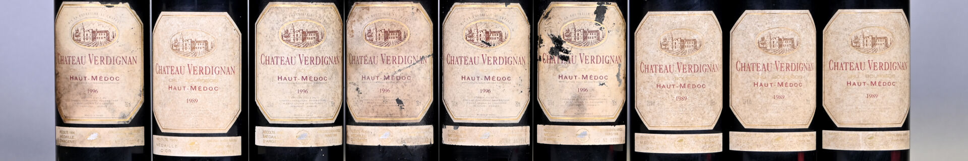 BORDEAUX – 9 bouteilles, Haut-Médoc, Château Verdignan, Cru Bourgeois, 1989 (4) et 1996 (5). 1 BG, 1 BG (-) et 1 TLB. Capsules légèrement sales. Etiquettes sales dont quatre sont abimées.