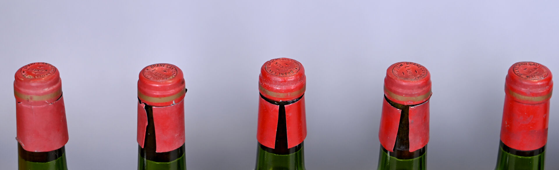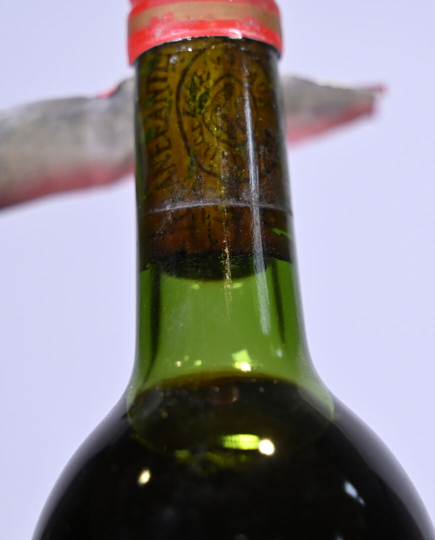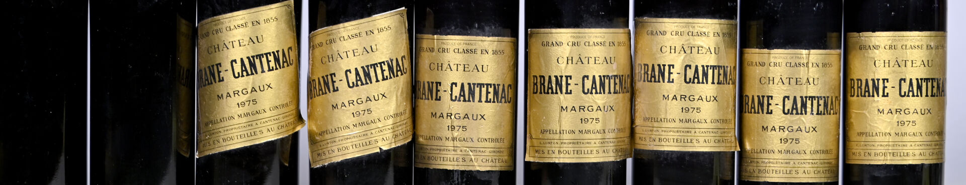 BORDEAUX – 9 bouteilles, Margaux, Château Brane-Cantenac, 2ème Grand Cru Classé, 1975 (millésime lisible sur le bouchon pour deux bouteilles). Trois bouchons légèrement engagés. 2 TLB, 1 HE (+), 1 HE, 1 HE (-), 3 ME (+) et 1 ME. Capsules légèrement sales et légèrement incurvées à incurvées. Quatre capsules ont été incisées pour les besoins de l’expertise. Etiquettes légèrement sales à sales dont deux sont manquantes. Trois étiquettes sont partiellement décollées et deux étiquettes sont entièrement décollées.