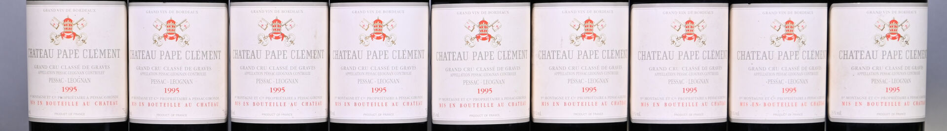 BORDEAUX – 9 bouteilles, Pessac-Léognan, Château Pape Clément, Grand Cru Classé, 1995. En caisse bois. Quelques légères traces sur les étiquettes.