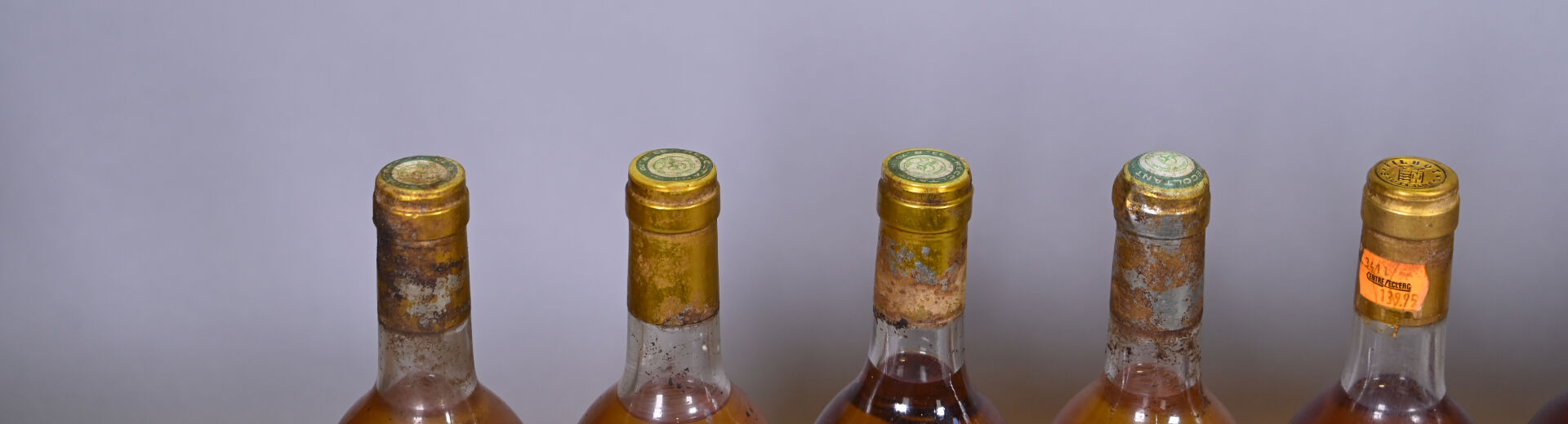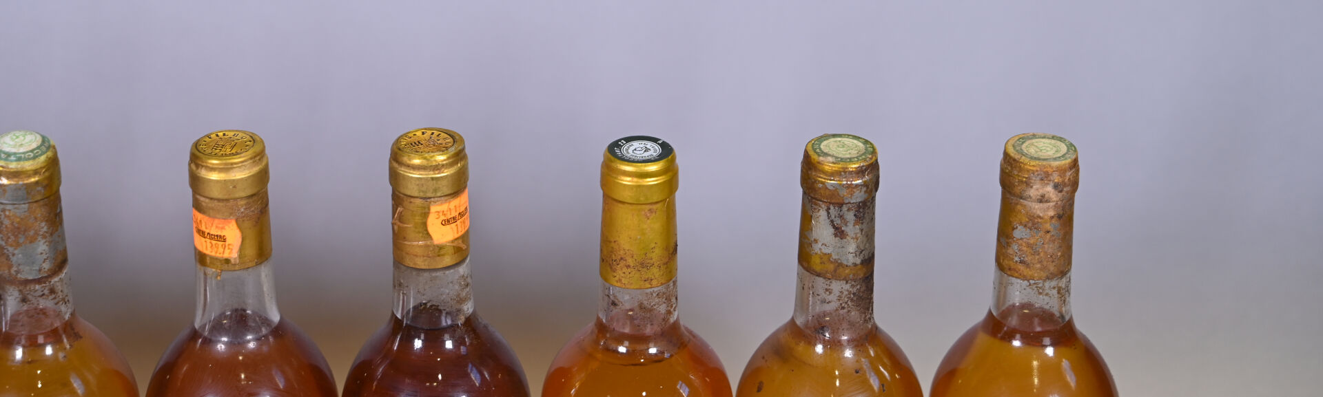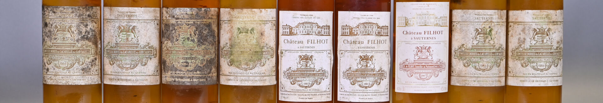 BORDEAUX – 9 bouteilles, Sauternes, Château Filhot, 2ème Grand Cru Classé, 1984 (6), 1990 (2) et 2007 (1). 2 BG (+), 2 BG, 3 BG (-) et 1 TLB (+). Capsules sales et abimées dont une est bombée. Etiquettes légèrement sales à très sales avec quelques points de décollement.