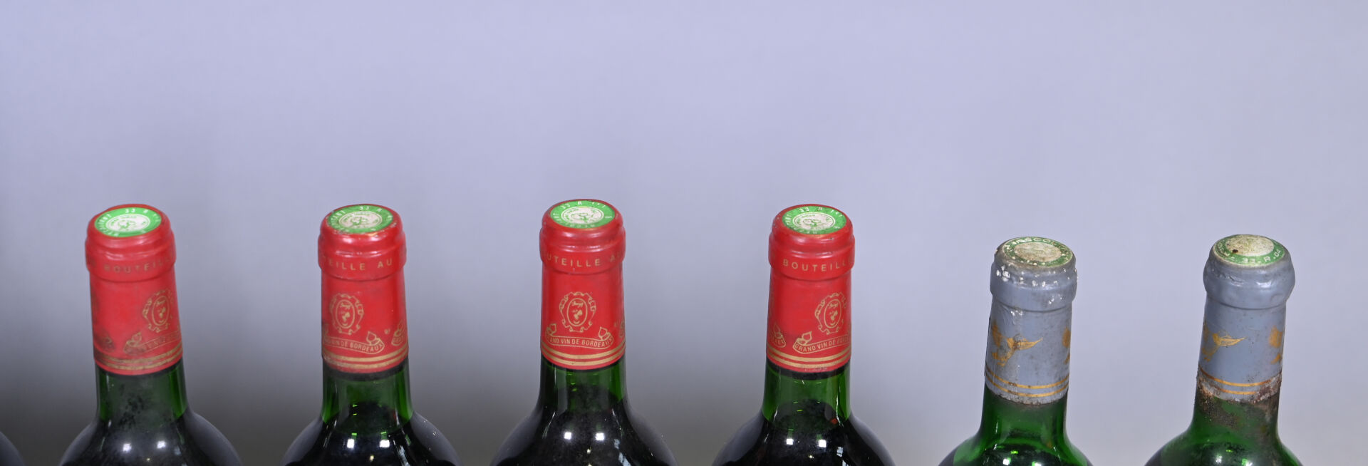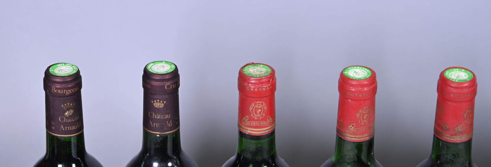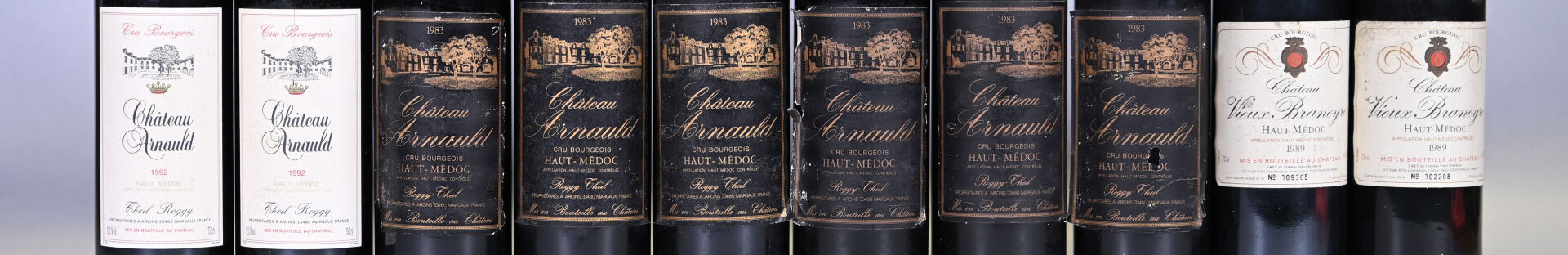 8 bouteilles, Haut-Médoc, Château Arnauld, Cru Bourgeois, 1983 (6) et 1992 (2). 1 BG, 2 BG (-) et 1 TLB. Capsules légèrement sales. Etiquettes légèrement sales à sales avec des points de décollement et dont trois sont abimées.