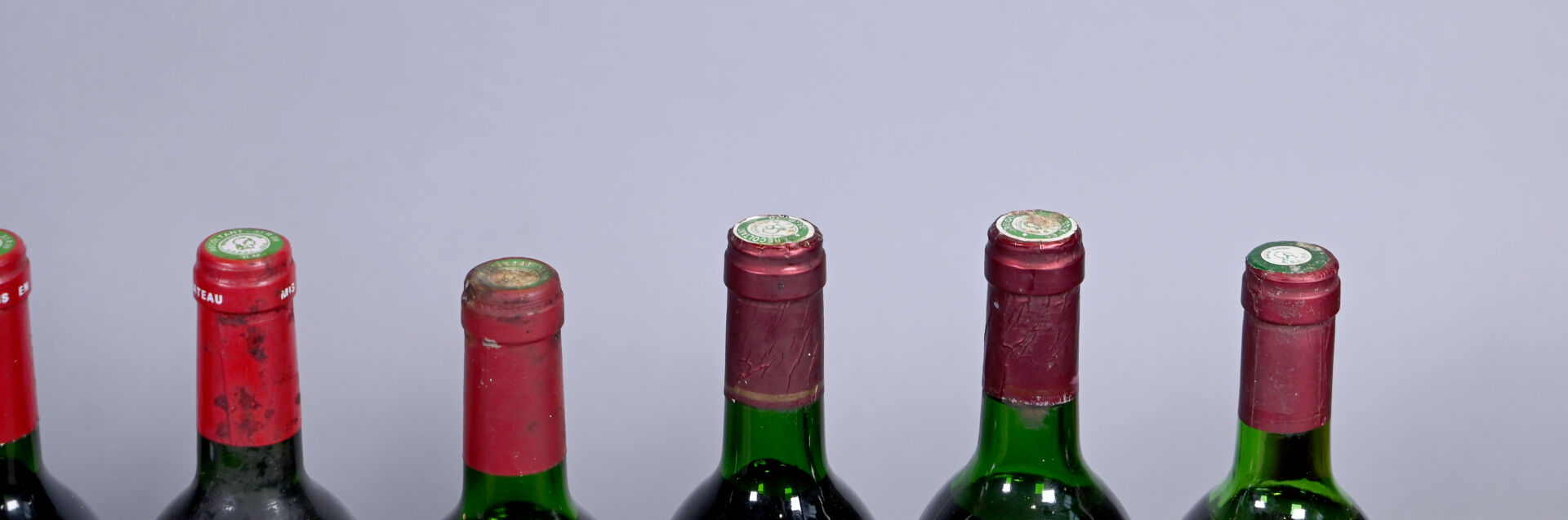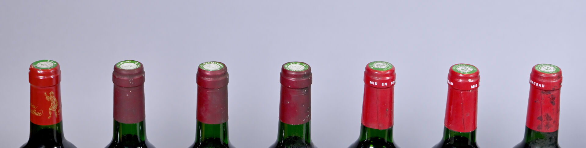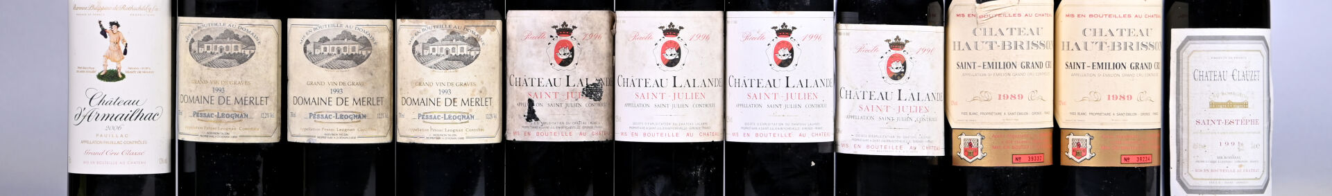 BORDEAUX – Ensemble de 11 bouteilles composé de : – 1 bouteille, Pauillac, Château d’Armailhac, 5ème Grand Cru Classé, 2006. 3 bouteilles, Pessac-Léognan, Domaine de Merlet, 1993. 1 BG et 2 BG (-). Capsules légèrement sales avec des traces de frottement. Etiquettes sales. Capsules légèrement abimées. Etiquettes légèrement sales. 1 bouteille, Saint-Estèphe, Château Clauzet, Cru Bourgeois, 1991. ME (+). Capsule sale. Etiquette sale avec des points de décollement. 2 bouteilles, Saint-Emilion Grand Cru, Château Haut-Brisson, 1989. 1 BG (-) et 1 HE. Capsules légèrement sales et abimées. Etiquettes légèrement sales avec des petits points de décollement dont une présente également une déchirure. 4 bouteilles, Saint-Julien, Château Lalande, 1990 (1) et 1996 (3). 2 BG, 1 TLB et 1 HE (+). Capsules légèrement sales dont une est incurvée (1990). Etiquettes sales, abimées et dont deux sont partiellement décollées.