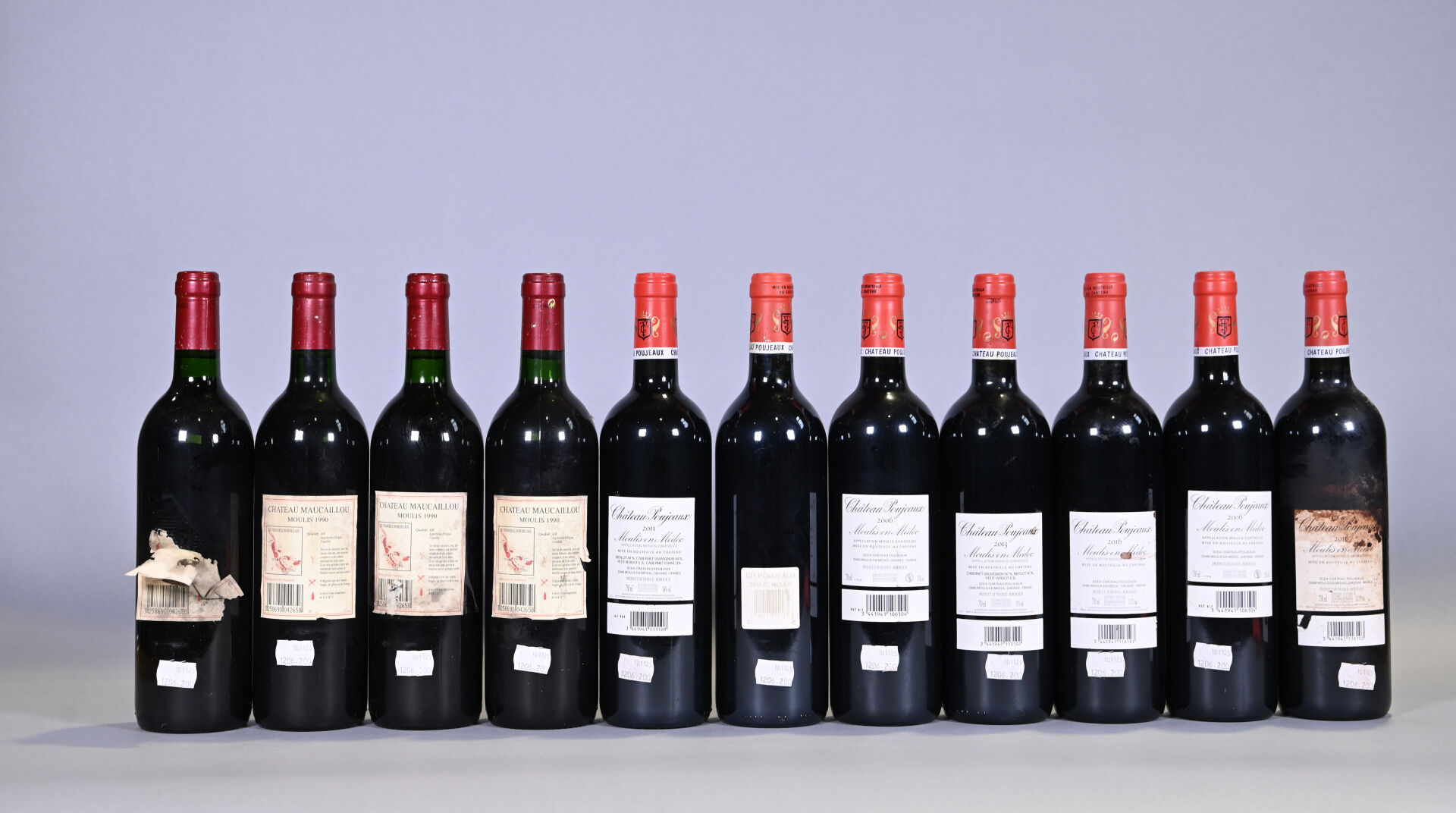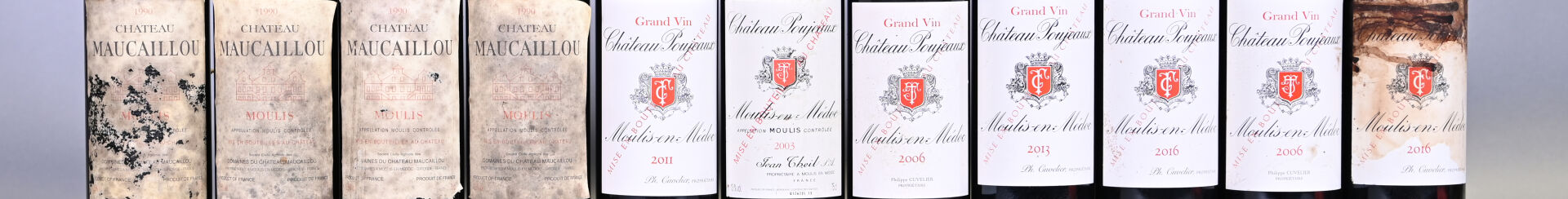 4 bouteilles, Moulis, Château Maucaillou, 1990. 4 BG. Capsules légèrement sales. Etiquettes sales avec des points de décollement et dont deux sont légèrement abimées à abimées. Une contre-étiquette est très dégradée et une autre partiellement décollée.