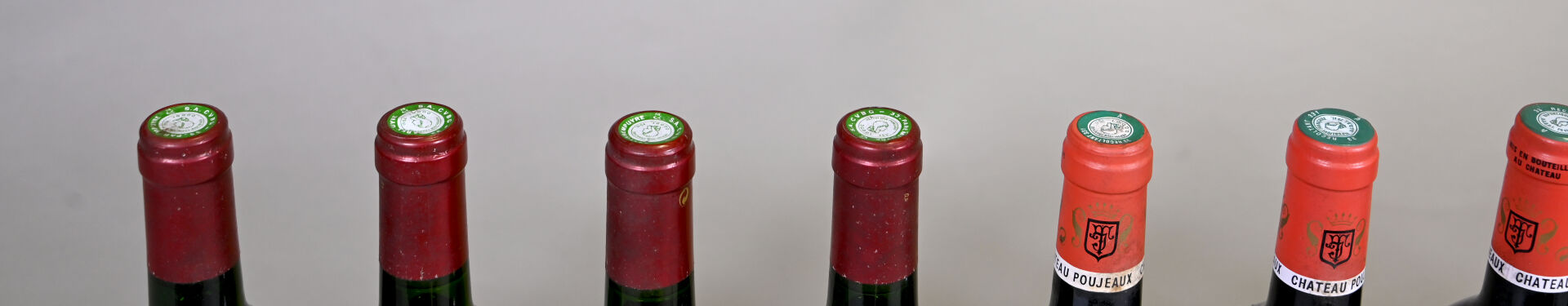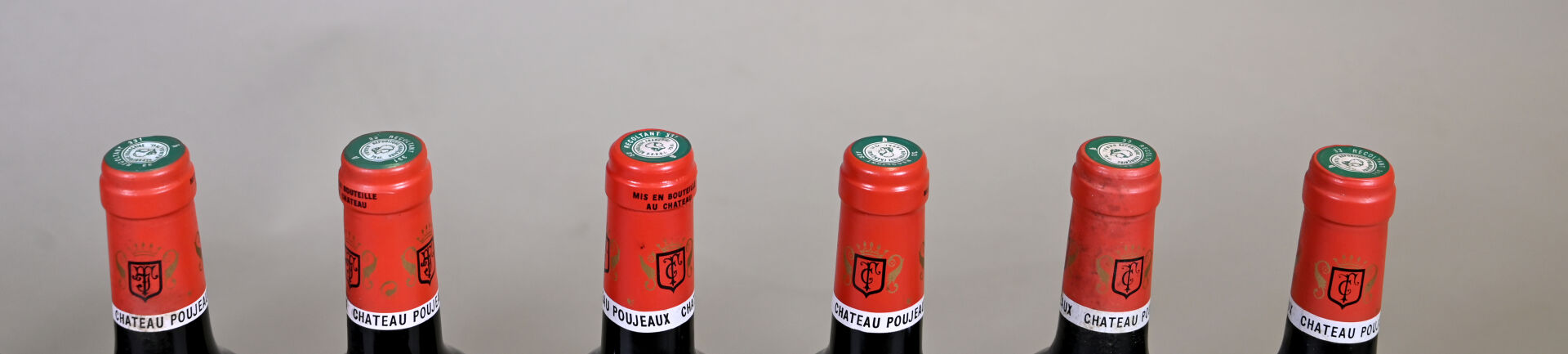 7 bouteilles, Moulis, Château Poujeaux, 2003 (1), 2006 (2), 2011 (1), 2013 (1) et 2016 (2). 1 BG. Capsules légèrement sales. Six étiquettes présentent quelques traces et une étiquette est très sale et très tachée.