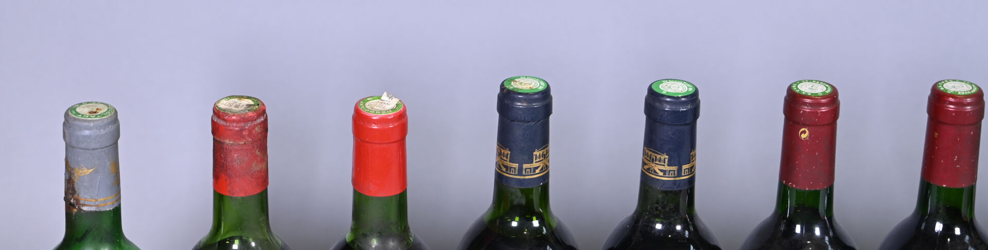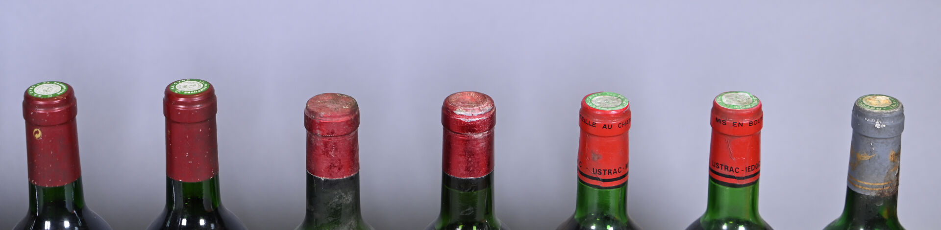 2 bouteilles, Listrac, Château Reverdi, 1976. 1 TLB et 1HE (+). Capsules légèrement sales. Etiquettes très sales avec des points de décollement.