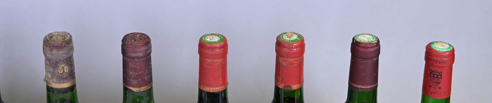 2 bouteilles, Saint-Estèphe, Château Beauséjour, 1979 (1) et 1982 (1). BG (+) et 1 HE (+). Capsules sales et abimées. Etiquettes sales.