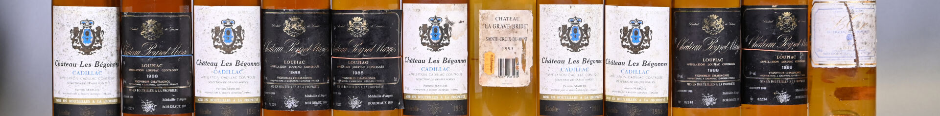 5 bouteilles, Cadillac, Château Les Bégonnes, 1988. En l’état.
