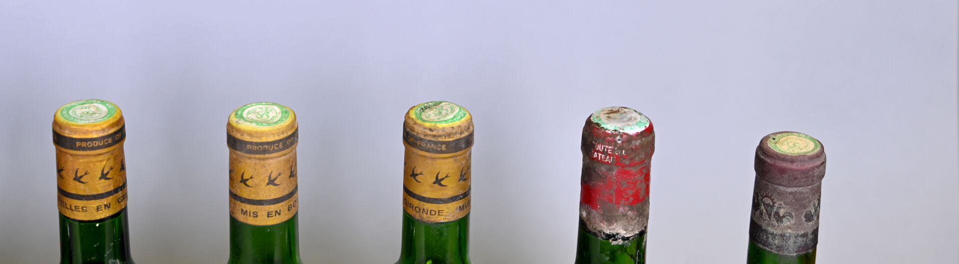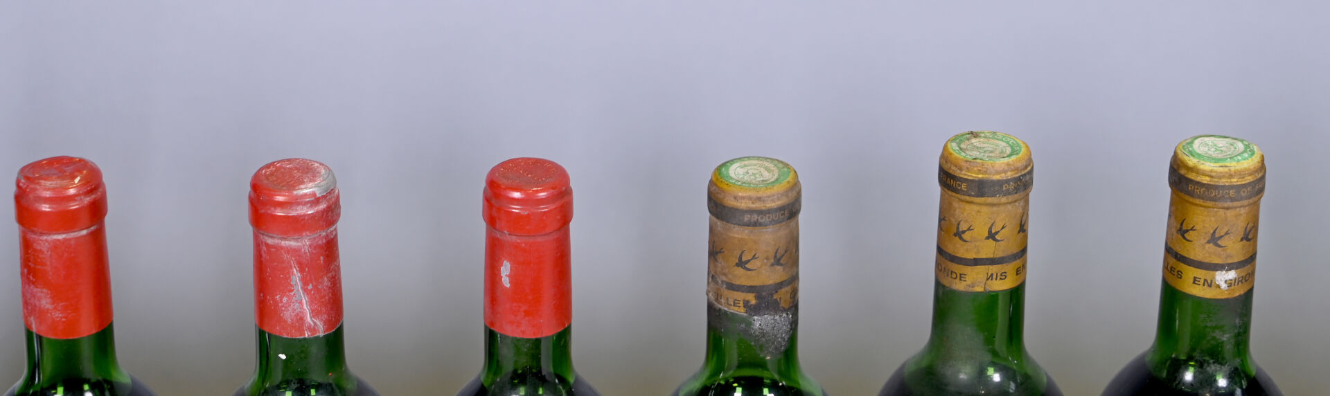 4 bouteilles, Pauillac, Château Fonbadet, 1982. 2 TLB (+) et 2 HE (+). Capsules légèrement sales, déformées en leur sommet et dont trois sont abimées. Etiquettes sales et dégradées.