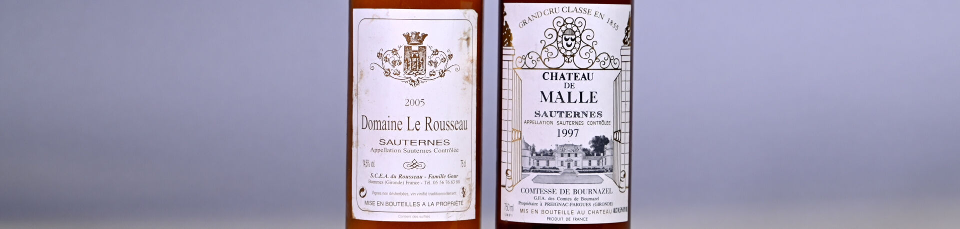 BORDEAUX – Ensemble de 2 bouteilles composé de : 1 bouteille, Sauternes, Château de Malle, 2ème Grand Cru Classé, 1997. Capsule avec des traces de frottement. 1 bouteille, Sauternes, Domaine Le Rousseau, 2005. BG (-). Etiquette légèrement sale.