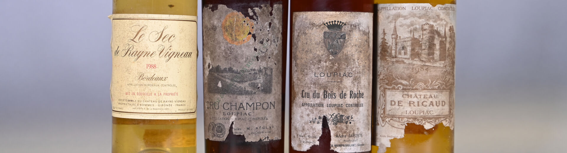 1 bouteille, Loupiac, Château de Ricaud, 1985. BG. Capsule légèrement sale en son sommet. Etiquette sale, dégradée avec un manque important.
