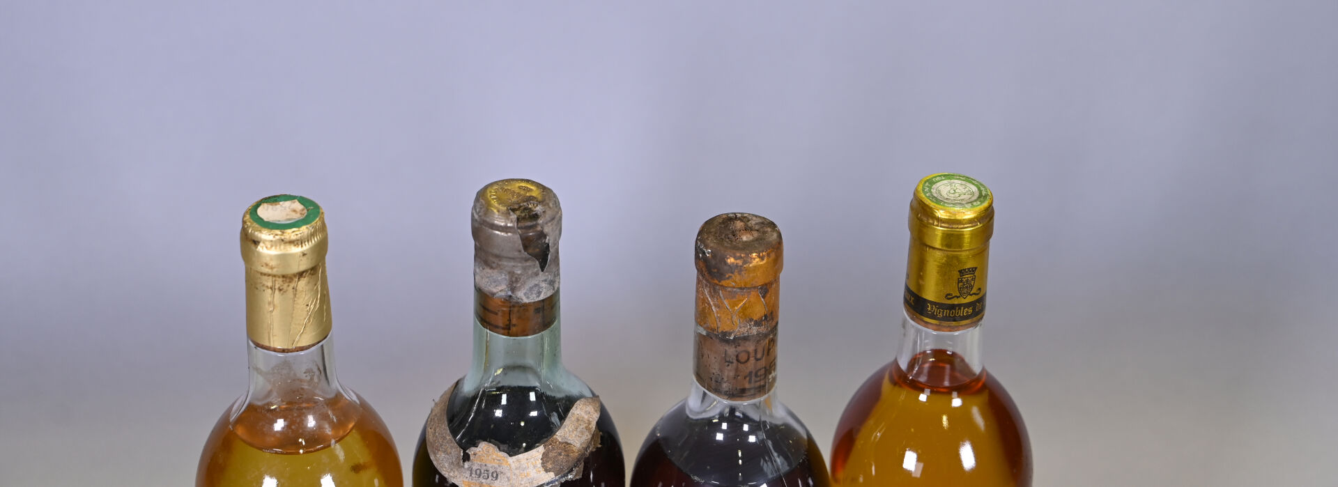 1 bouteille, Haut-Loupiac, Cru Champon, 1959. ME (+). Capsule sale avec une importante déchirure. Collerette sale, abimée avec des points de décollement. Etiquette sale à très sale et dégradée.