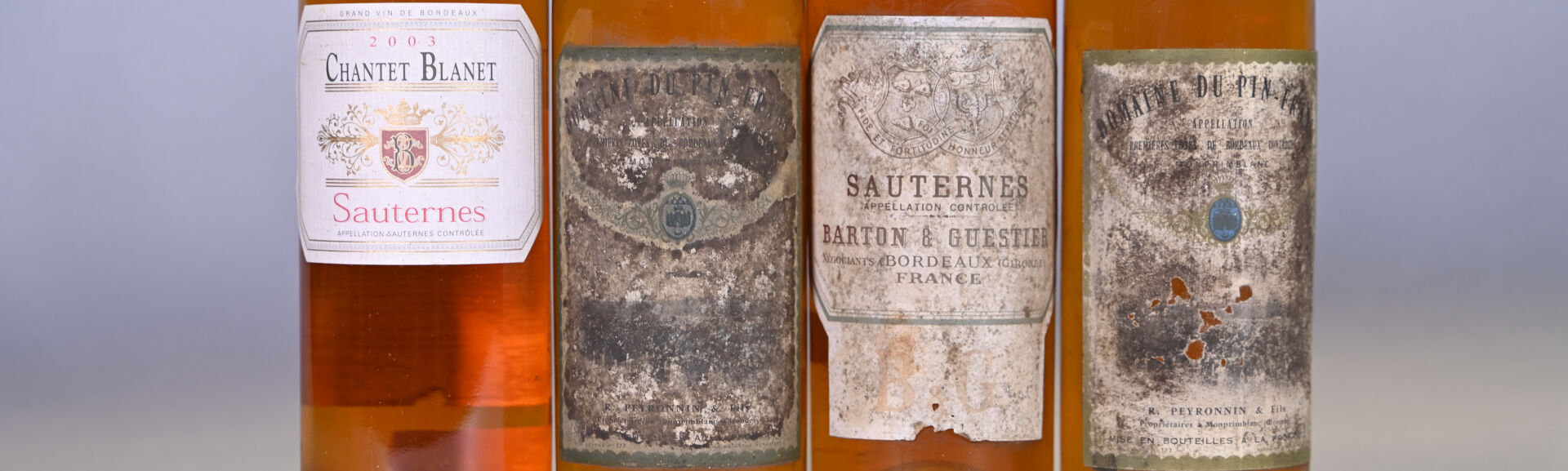 1 bouteille, Sauternes, Barton et Guestier, millésime ? BG. Capsule légèrement sale et incisée pour les besoins de l’expertise. Etiquette sale et légèrement abimée.