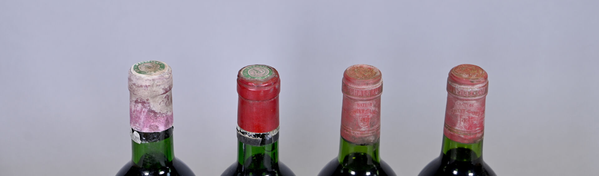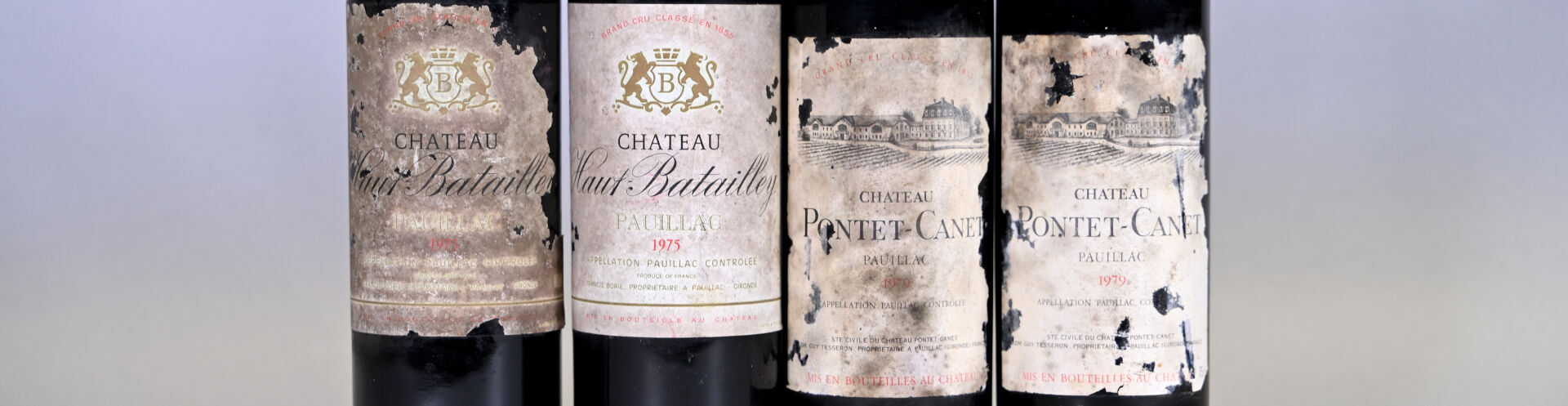 2 bouteilles, Pauillac, Château Haut Batailley, 5ème Grand Cru Classé, 1975. 2 BG. Capsules abimées légèrement sale pour une et très sale pour l’autre. Etiquettes légèrement sales à sales et légèrement abimées à abimées.