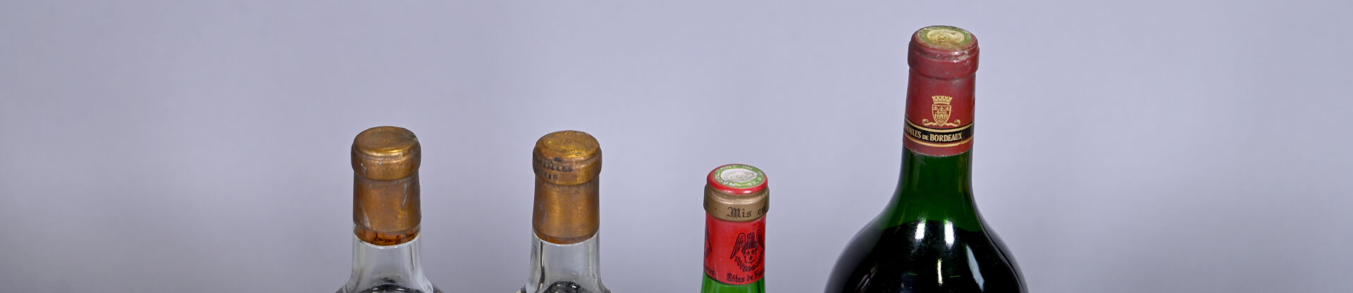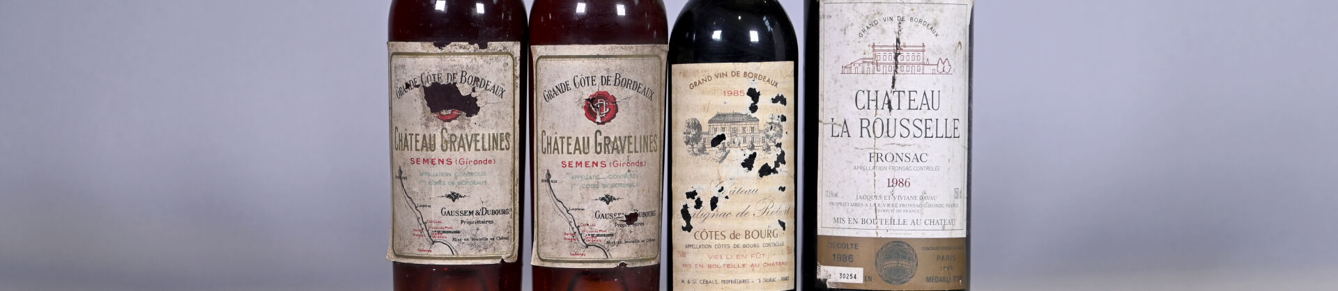 BORDEAUX – Ensemble de 4 flacons composé de : 1 magnum, Fronsac, Château La Rousselle, 1986. Capsule sale en son sommet. Etiquette sale et partiellement décollée. 2 bouteilles, Premières Côtes de Bordeaux (moelleux), Château de Gravelines, 1934. Un bouchon légèrement engagé. 1 TLB (-) et 1 HE (+). Capsules sales. Collerettes sales dont une est dégradée. Etiquettes sales à très sales, dégradées avec des points de décollement. 1 bouteille, Côtes de Bourg, Château Saulignac de Robert ? 1985. TLB (-). Capsule légèrement sale et déformée en son sommet. Etiquette sale et dégradée.