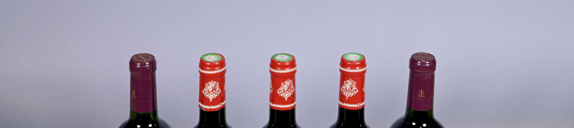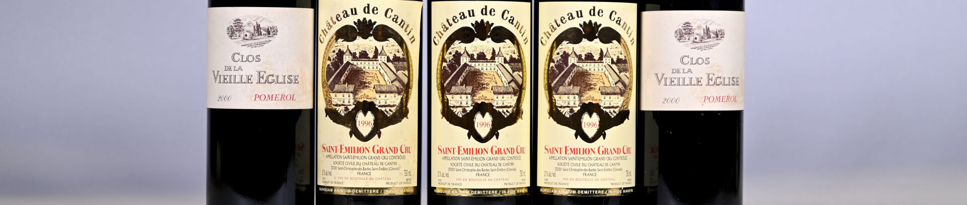 BORDEAUX – Ensemble de 5 bouteilles composé de : 3 bouteilles, Saint-Emilion Grand Cru, Château de Cantin, 1996. 2 BG (-) et 1 TLB (+). Etiquettes avec des traces dont une présente un petit point de décollement au niveau de son angle droit supérieur. 2 bouteilles, Pomerol, Clos de la Vieille Eglise, 2000. 1 BG (+) et 1 BG. Etiquettes avec quelques très légères traces.