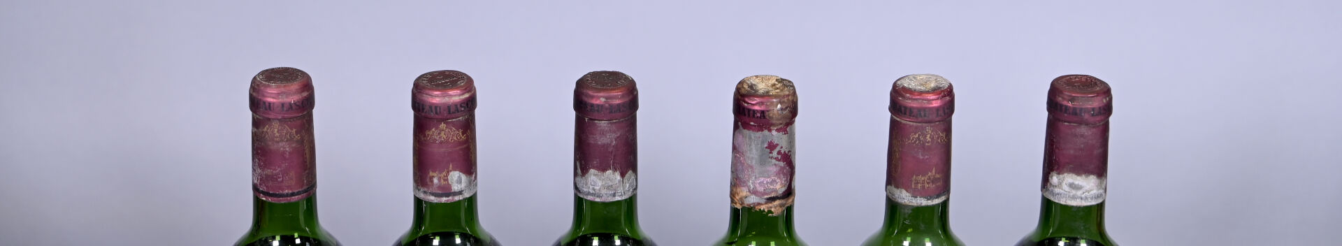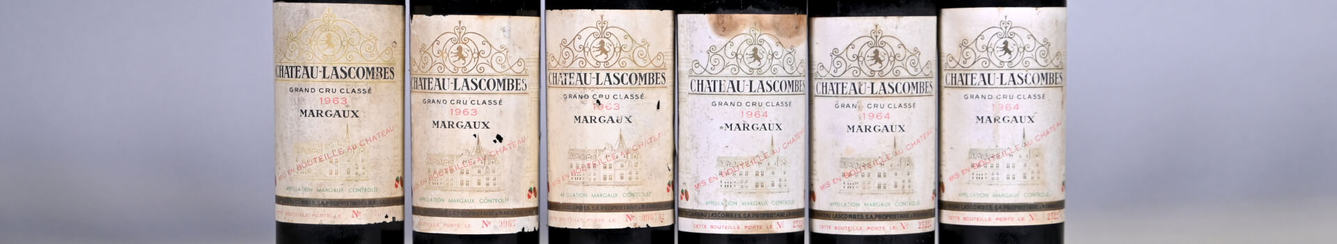 BORDEAUX – Ensemble de 6 bouteilles composé de : 3 bouteilles, Margaux, Château Lascombes, 2ème Grand Cru Classé, 1963. 2 HE et 1 HE (-). Capsules sales. Etiquettes légèrement sales à sales et légèrement abimées. 3 bouteilles, Margaux, Château Lascombes, 2ème Grand Cru Classé, 1964. Deux bouchons légèrement engagés. 1 HE (+), 1 ME et 1 ME (-). Capsules sales, incurvées et abimées. Etiquettes légèrement sales à sales et tachées avec quelques traces de frottement.