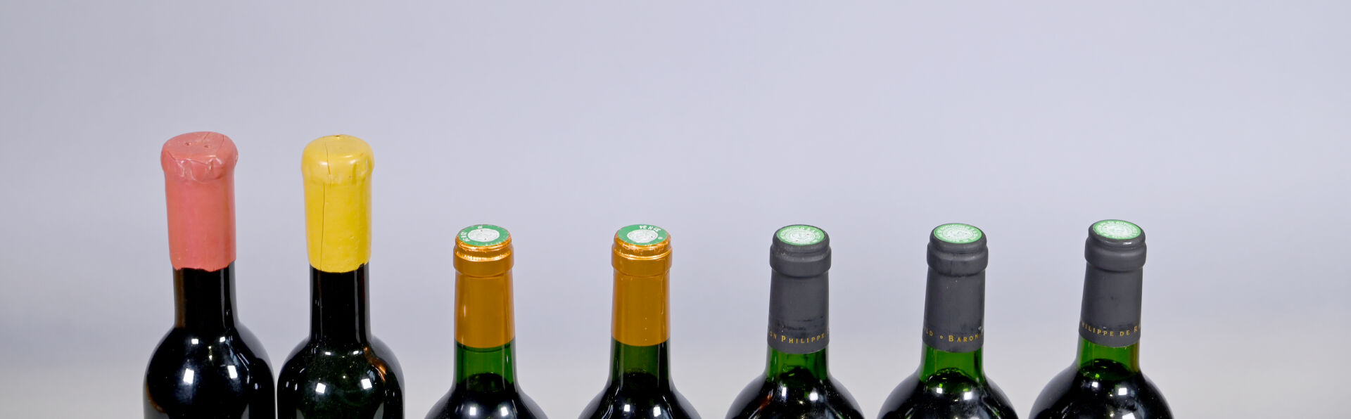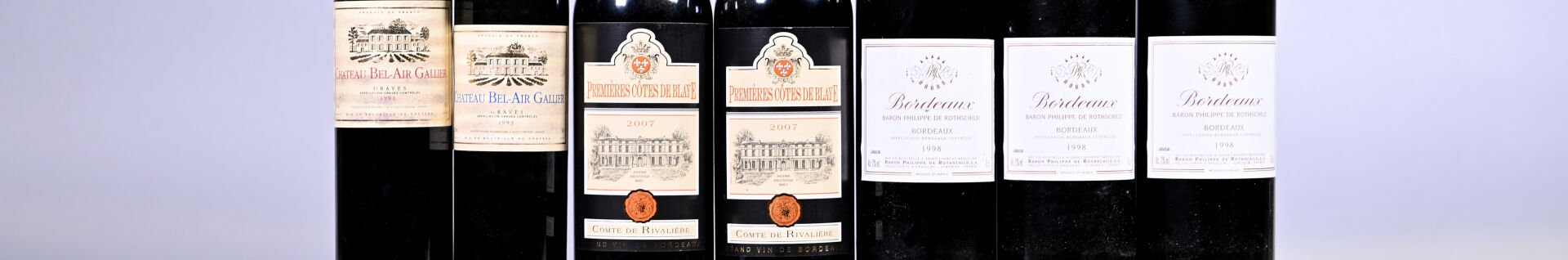 BORDEAUX – Ensemble de 7 bouteilles composé de : 3 bouteilles, Bordeaux, Baron Philippe de Rothschild, 1998. En coffret bois d’origine. 2 BG et 1 TLB. Etiquettes avec de légères traces. 2 bouteilles, Premières Côtes de Blaye, Comte de Rivalière, 2007. En coffret bois. 2 BG. 1 medium (50 cl), Graves, Château Bel-Air Gallier, 1992. Capsule en cire abimée. Etiquette légèrement sale. 1 medium (50 cl), Graves (blanc), Château Bel-Air Gallier, 1993. Capsule en cire abimée. Etiquette légèrement sale.