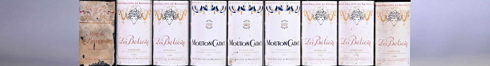 BORDEAUX – Ensemble de 9 bouteilles composé de : – 1 bouteille, Pauillac, Baron Philippe de Rothschild, Mise de la Baronnie, 1996. En l’état. 3 bouteilles, Bordeaux, Baron Philippe de Rothschild, Mouton Cadet, 1991. En l’état. 5 bouteilles, Bordeaux, Baron Philippe de Rothschild, La Bélière, 1995 (3) et 1996 (2). En l’état.
