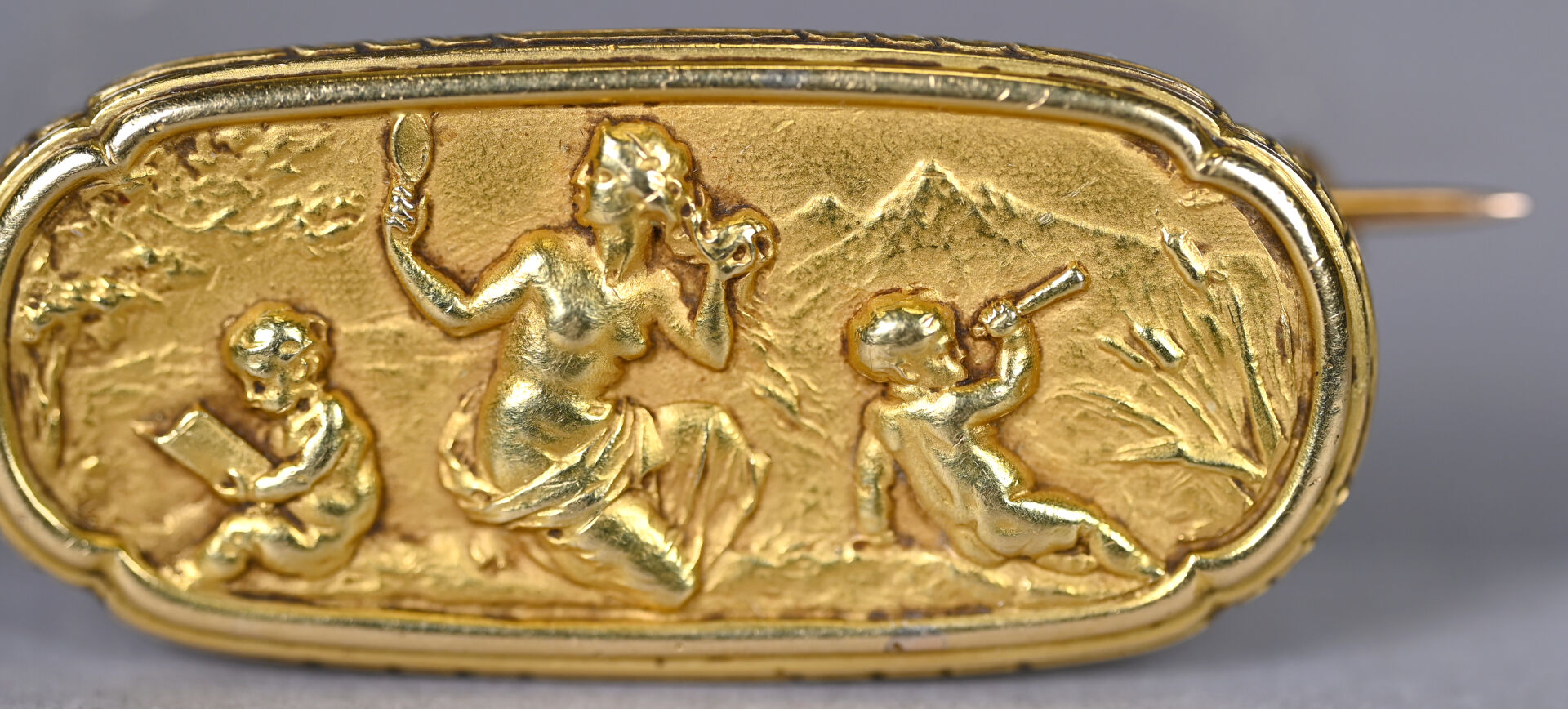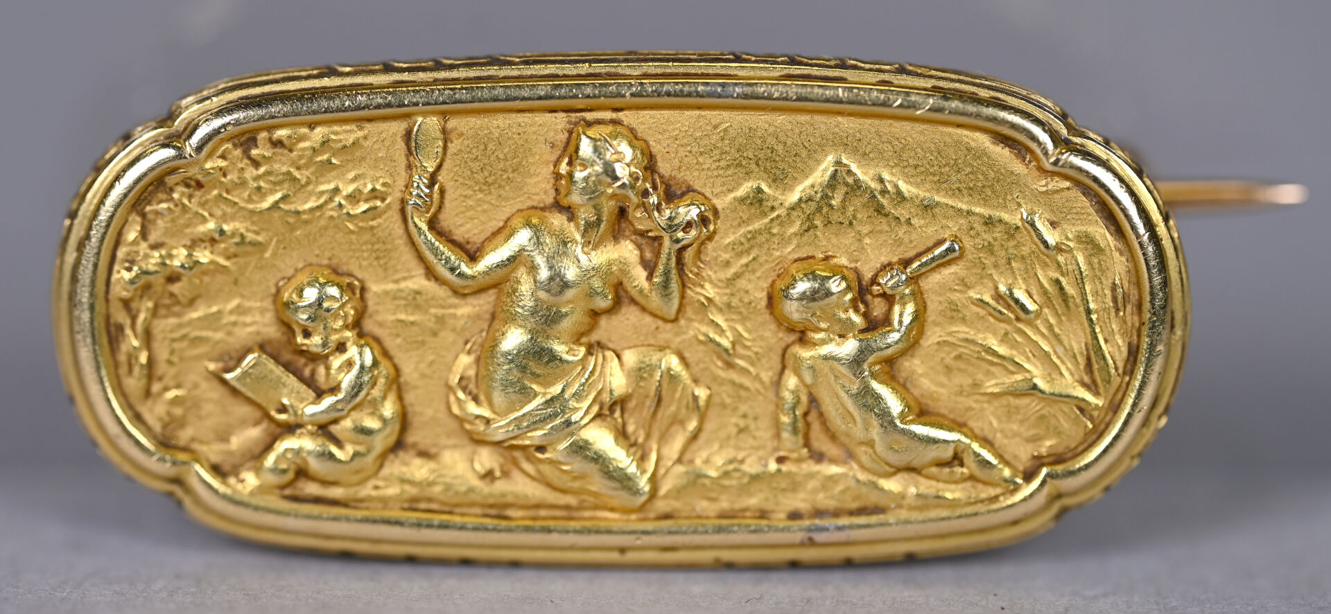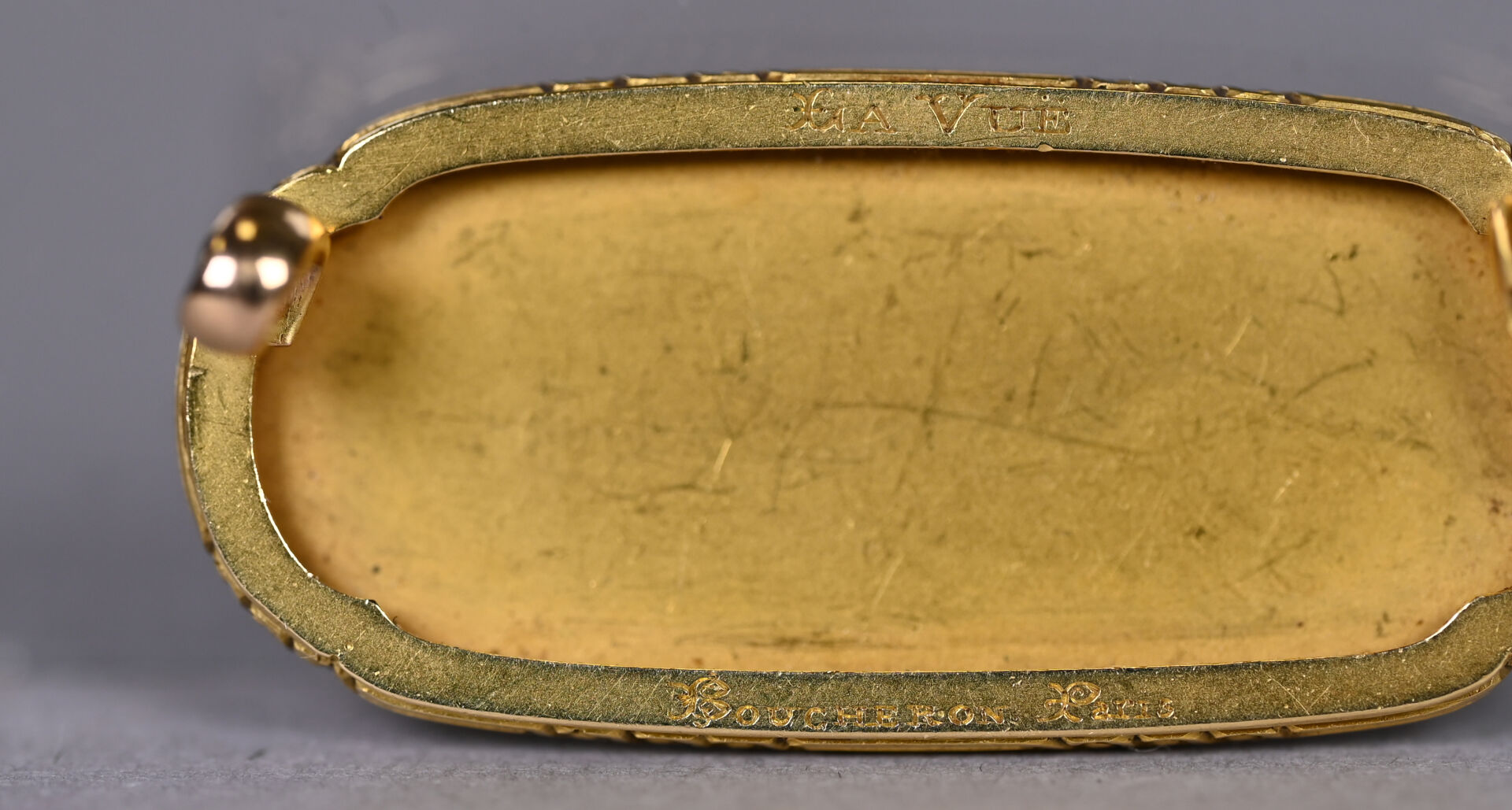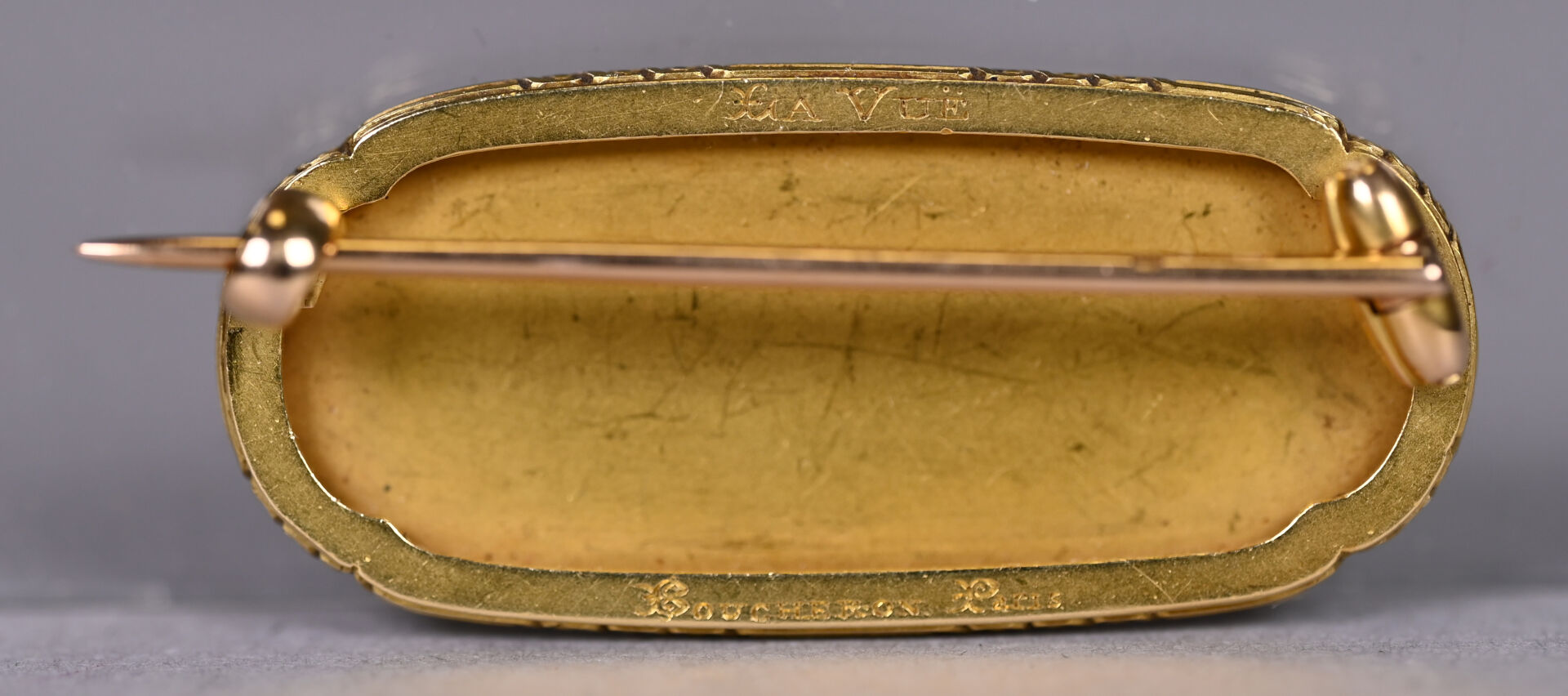 BOUCHERON PARIS. Rare broche en or jaune 18k 750/1000e nommée « La Vue » figurant une femme se regardant dans un miroir accompagnée de deux enfants. Élégant travail de ciselure de la fin du XIXe siècle. Signée au dos. Portant le poinçon d’orfèvre » A étoile à cinq branches en hauteur M ». Haut. 1,8 cm. Long. 3,5 cm. Dans son écrin de la maison. Poids : 10,3 g. L’histoire de la maison Boucheron (fondée en 1858) est marquée par son innovation, son savoir-faire exceptionnel et sa capacité à créer des bijoux emblématiques et intemporels.