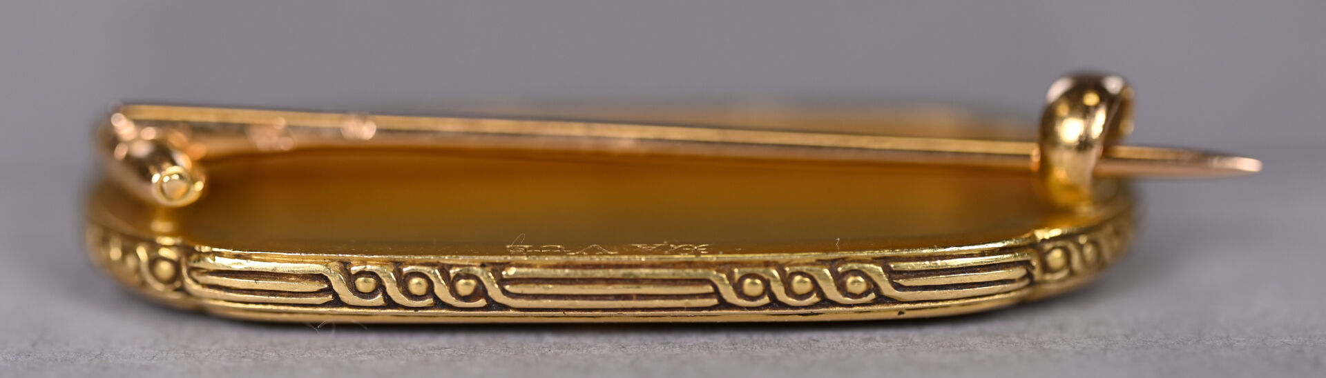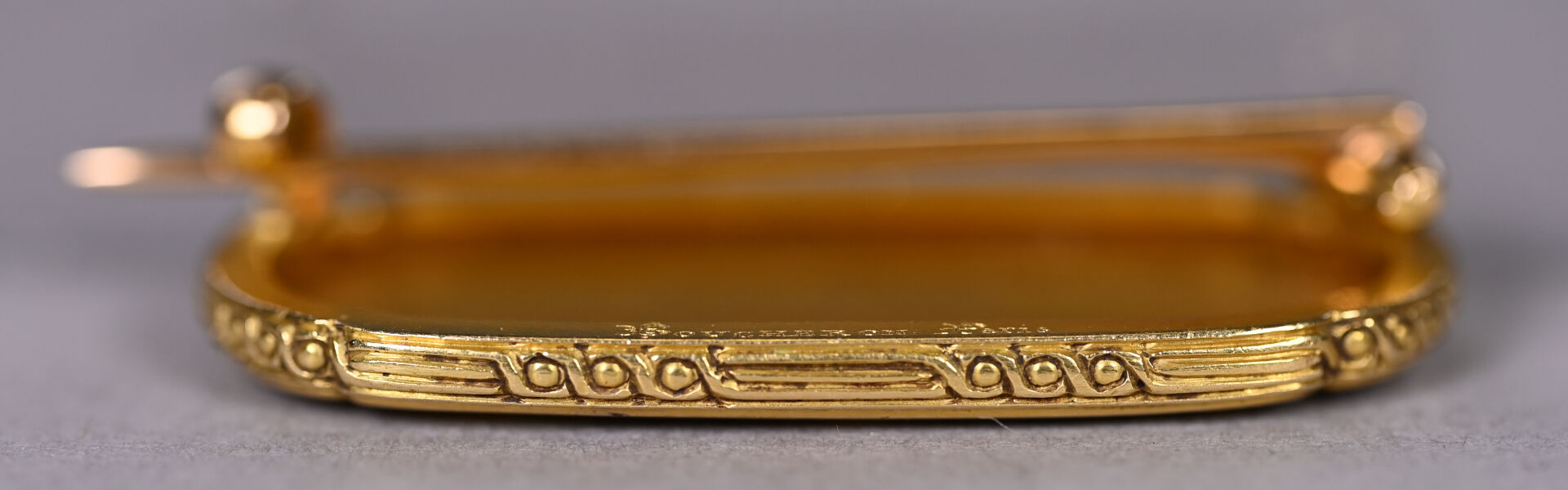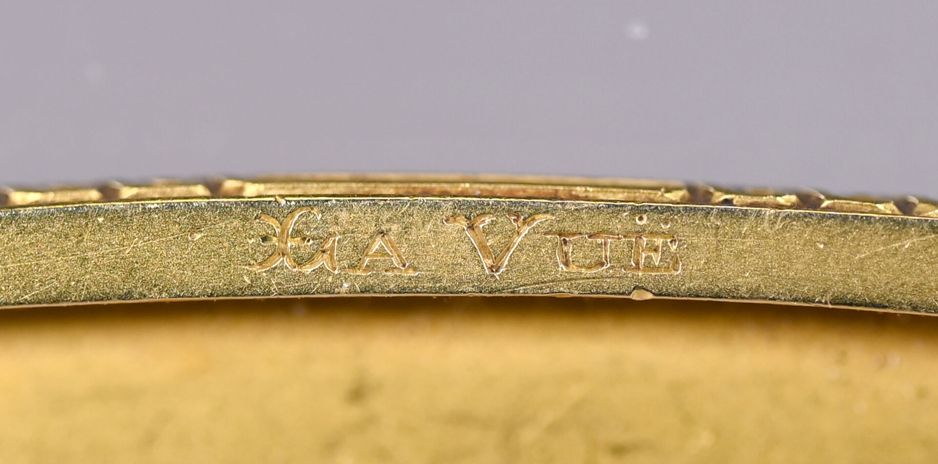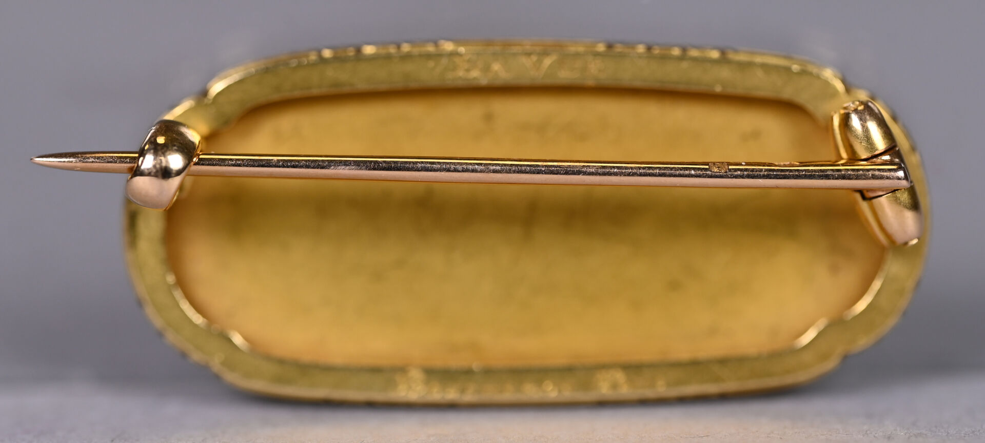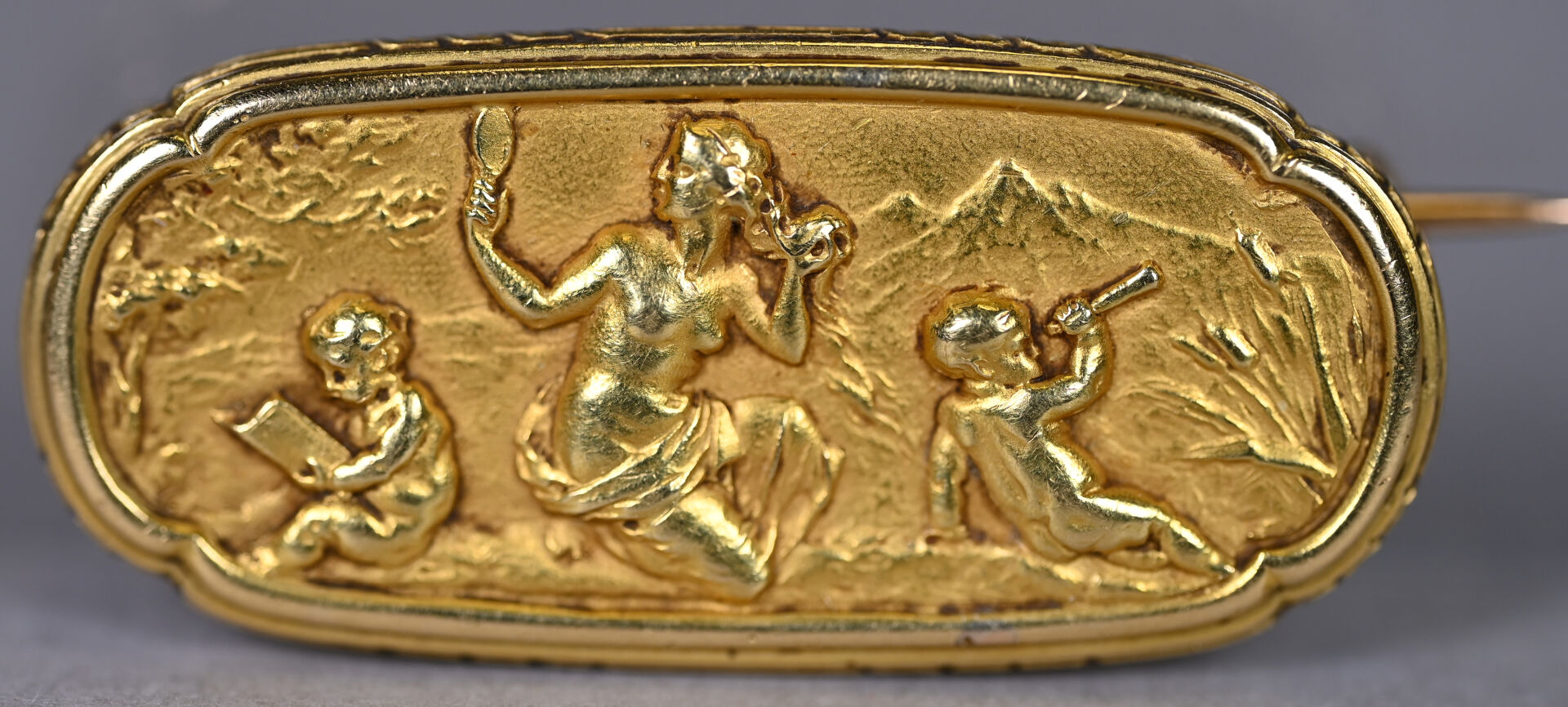 BOUCHERON PARIS. Rare broche en or jaune 18k 750/1000e nommée « La Vue » figurant une femme se regardant dans un miroir accompagnée de deux enfants. Élégant travail de ciselure de la fin du XIXe siècle. Signée au dos. Portant le poinçon d’orfèvre » A étoile à cinq branches en hauteur M ». Haut. 1,8 cm. Long. 3,5 cm. Dans son écrin de la maison. Poids : 10,3 g. L’histoire de la maison Boucheron (fondée en 1858) est marquée par son innovation, son savoir-faire exceptionnel et sa capacité à créer des bijoux emblématiques et intemporels.