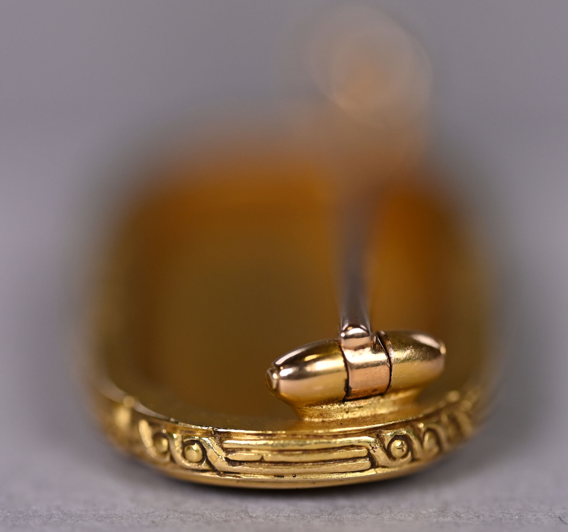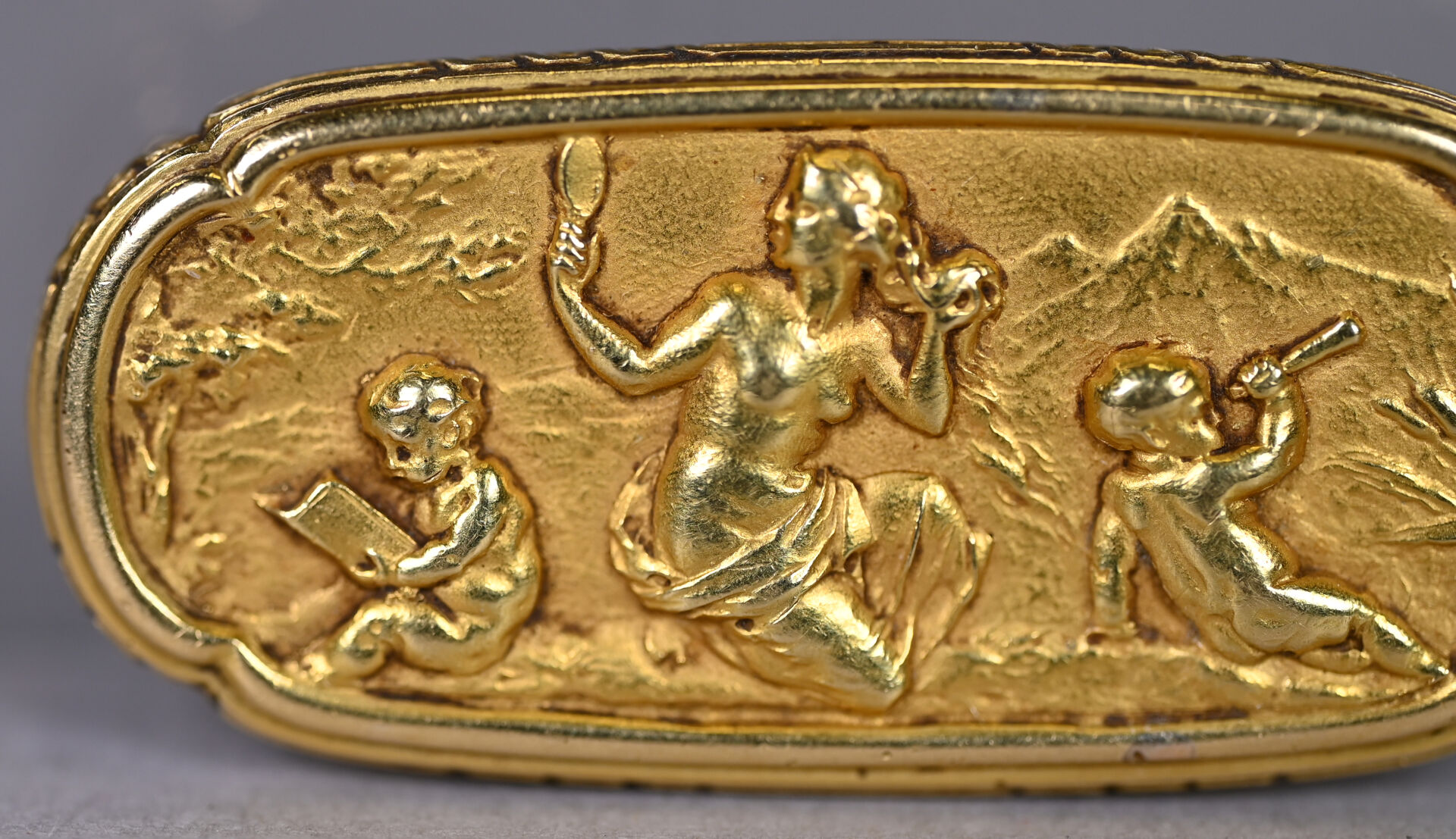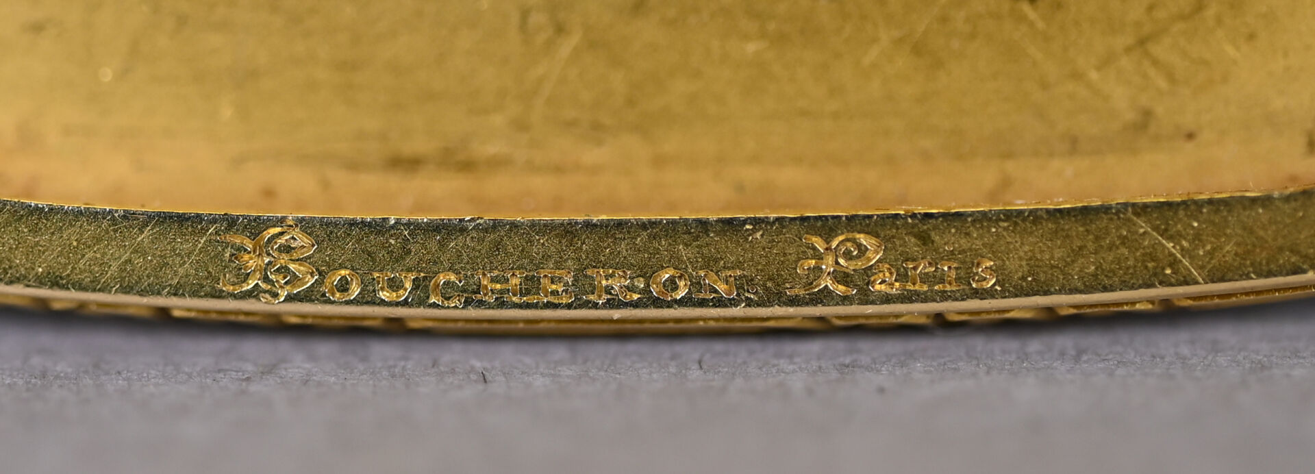 BOUCHERON PARIS. Rare broche en or jaune 18k 750/1000e nommée « La Vue » figurant une femme se regardant dans un miroir accompagnée de deux enfants. Élégant travail de ciselure de la fin du XIXe siècle. Signée au dos. Portant le poinçon d’orfèvre » A étoile à cinq branches en hauteur M ». Haut. 1,8 cm. Long. 3,5 cm. Dans son écrin de la maison. Poids : 10,3 g. L’histoire de la maison Boucheron (fondée en 1858) est marquée par son innovation, son savoir-faire exceptionnel et sa capacité à créer des bijoux emblématiques et intemporels. Son fondateur, Frédéric Boucheron avait un goût sûr, rempli d’originalité et sa maîtrise des techniques artisanales attirent rapidement l’attention des grandes familles royales et des aristocrates. Quelques discrets artisans ciseleurs vont travailler pour la maison afin de fournir des pièces d’une grande qualité telle que notre broche présentée ce jour.