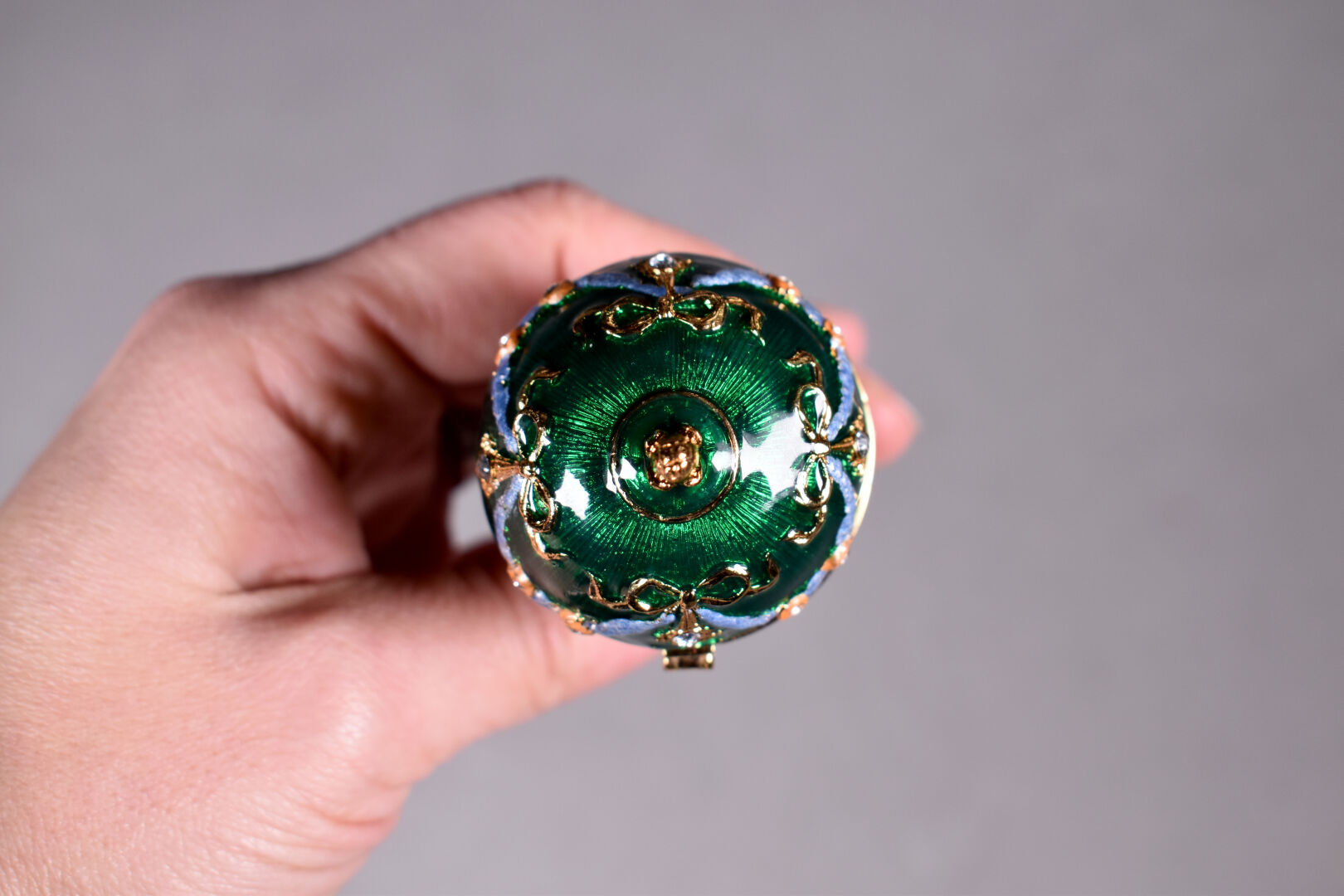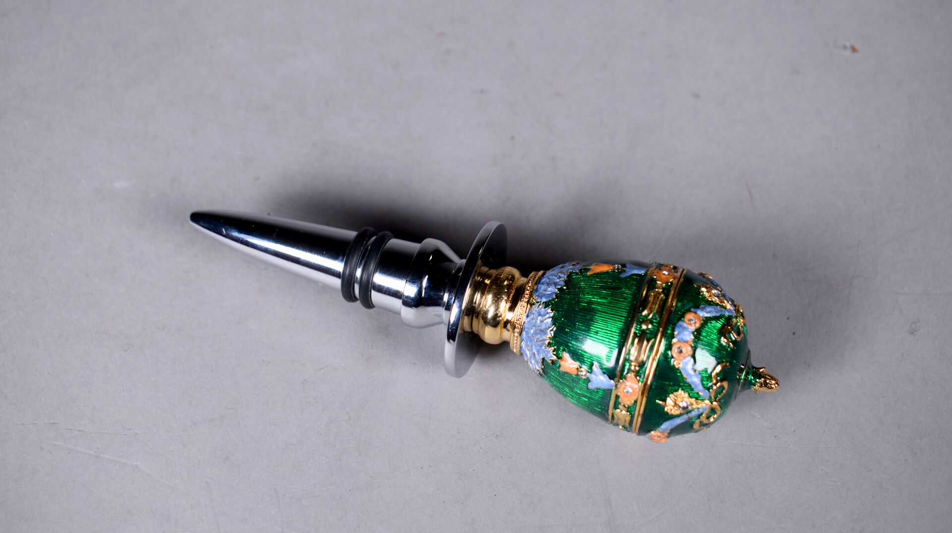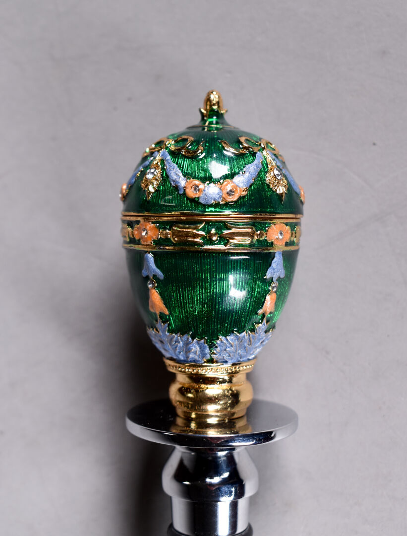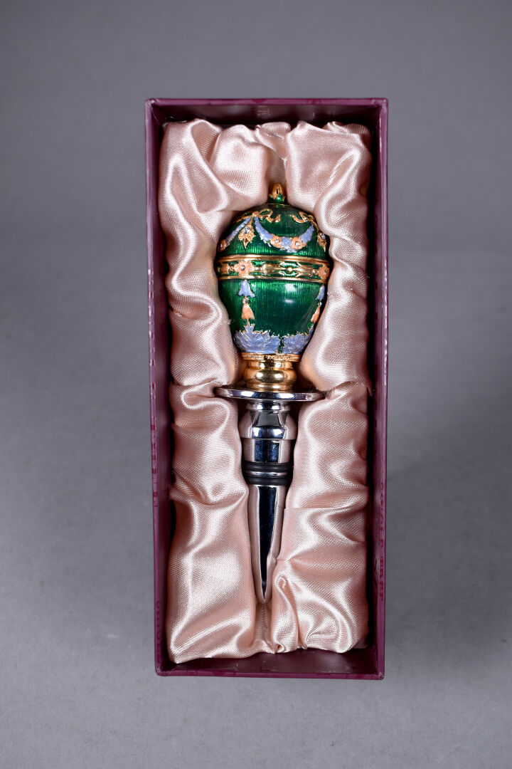 Bouchon de bouteille surmonté d’un oeuf dans le goût de Fabergé. Avec sa boîte. Haut. : 14.5 cm.