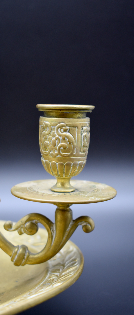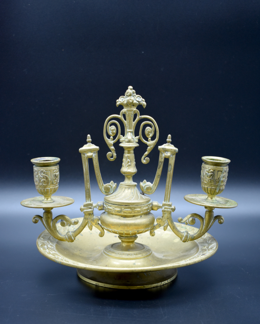Bougeoir double, centre de tableen bronze à décor ciselé de torsades, frise de branches d’olivier(en partie à refixer). Epoque Napoléon III. Haut. : 21 cm.