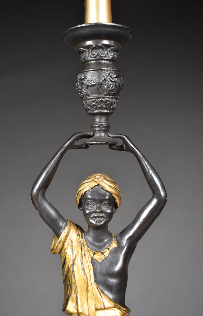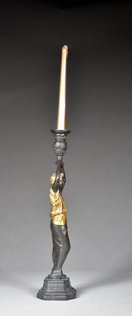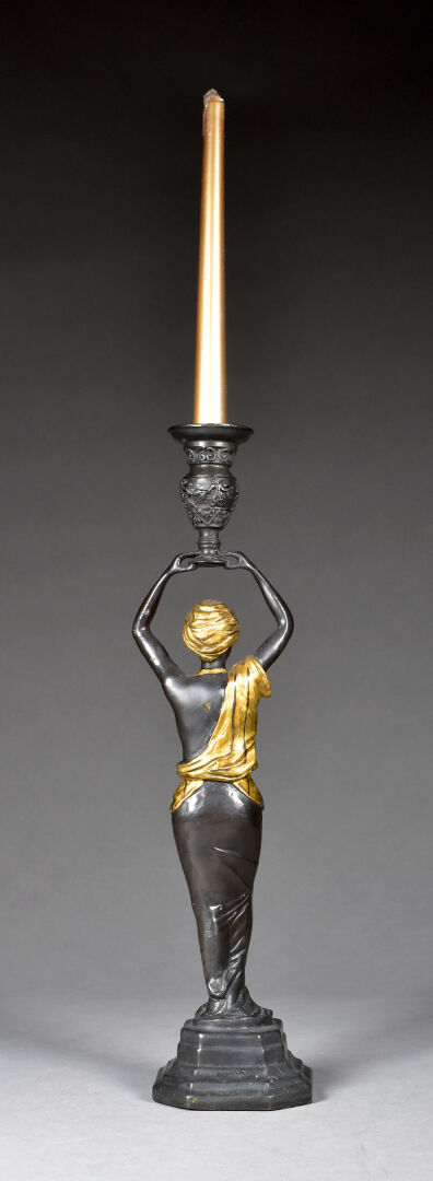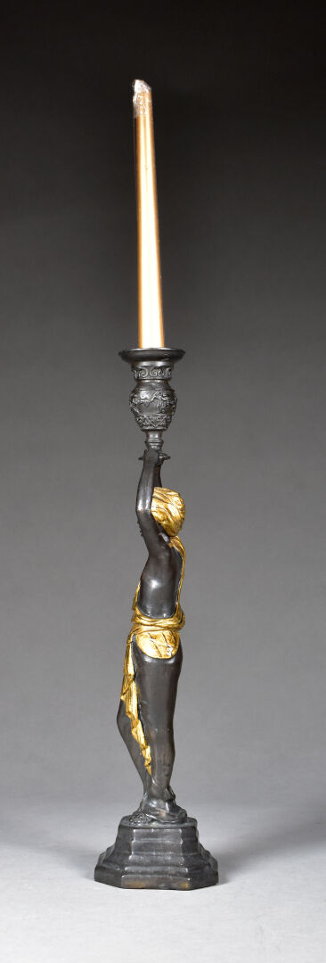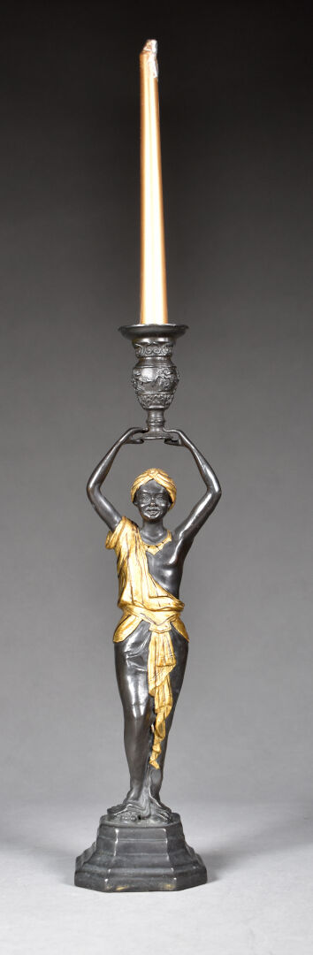 Bougeoir en bronze à patine brun et or, le fût figurant un nubien. Haut. : 39.5 cm.