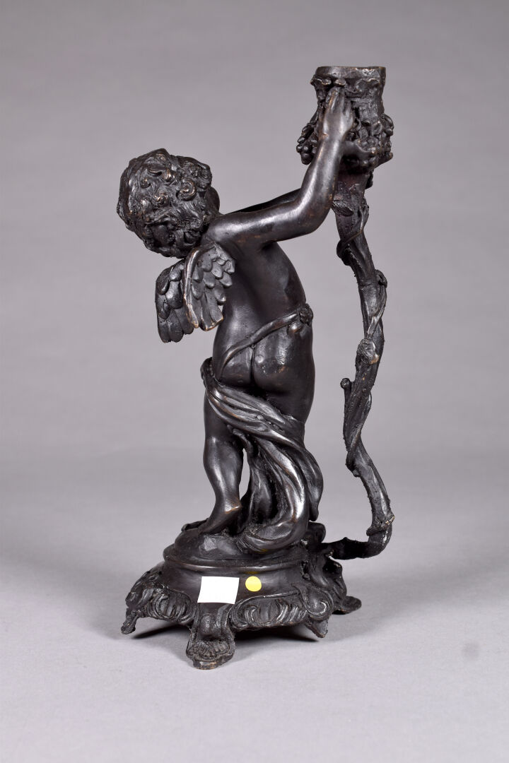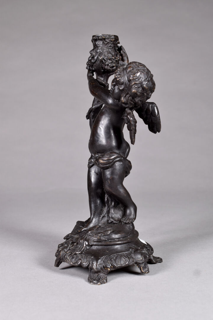 Bougeoir en bronze patiné brun représentant un angelot tenant une bobèche. Début du XXe siècle. Haut. : 30 cm.