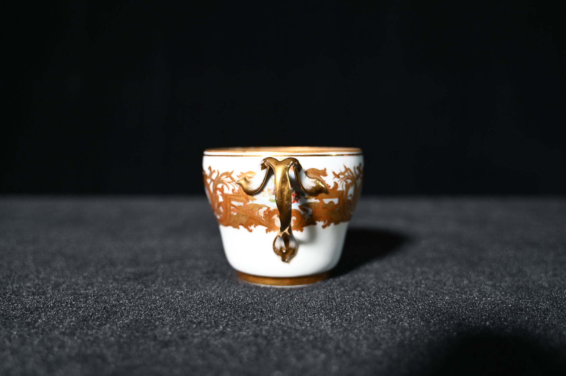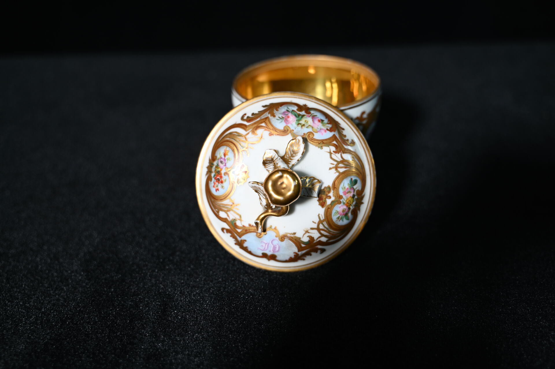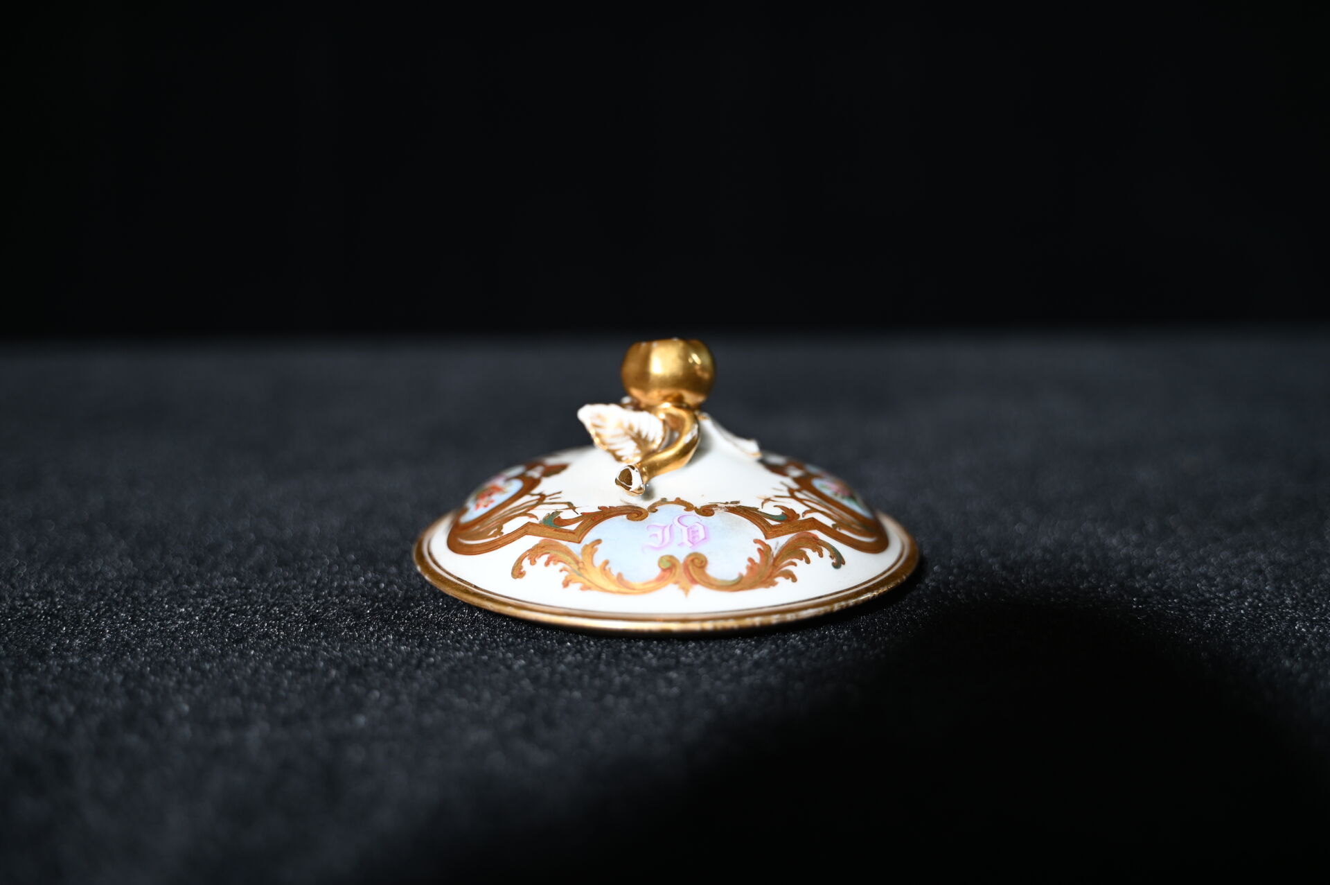 Bouillon couvert en porcelaine à décor émaillé en polychromie et dorure de fleurs, acanthes, chiffré (un petit éclat sur la prise du couvercle). Haut. : 14,5 cm. Pour expertise : la fiche et les estimations seront bientôt modifiées.