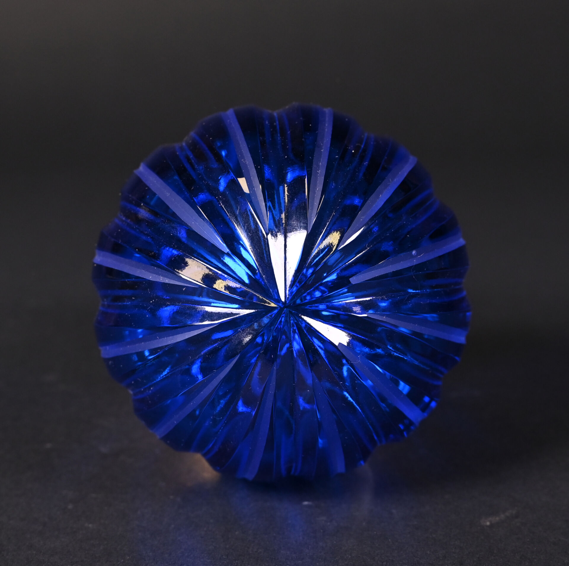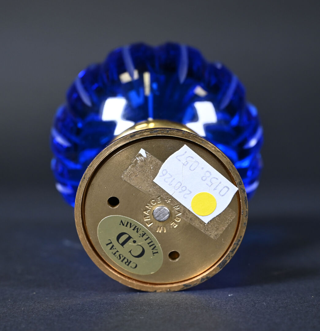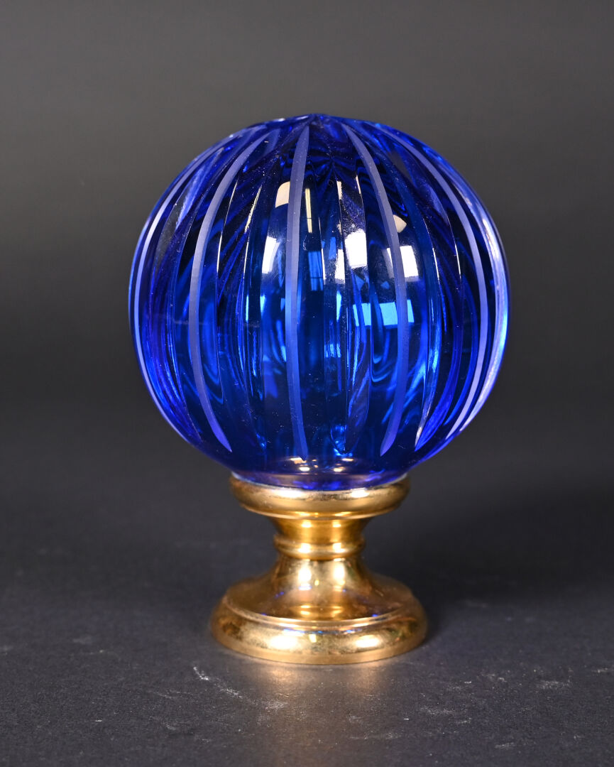 Boule d’escalier en laiton et cristal gravé bleu. XXe siècle. Haut. : 14 cm.