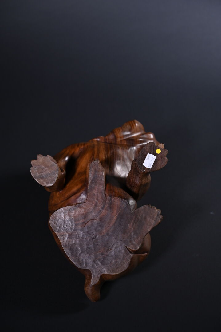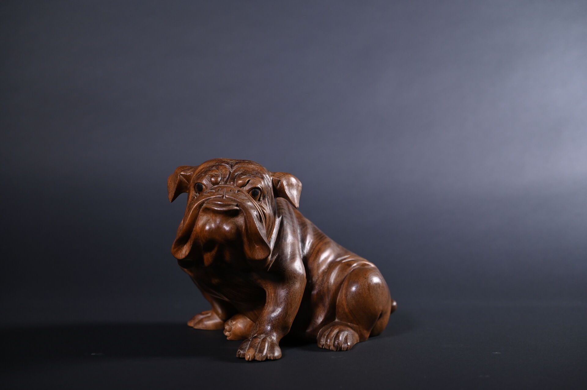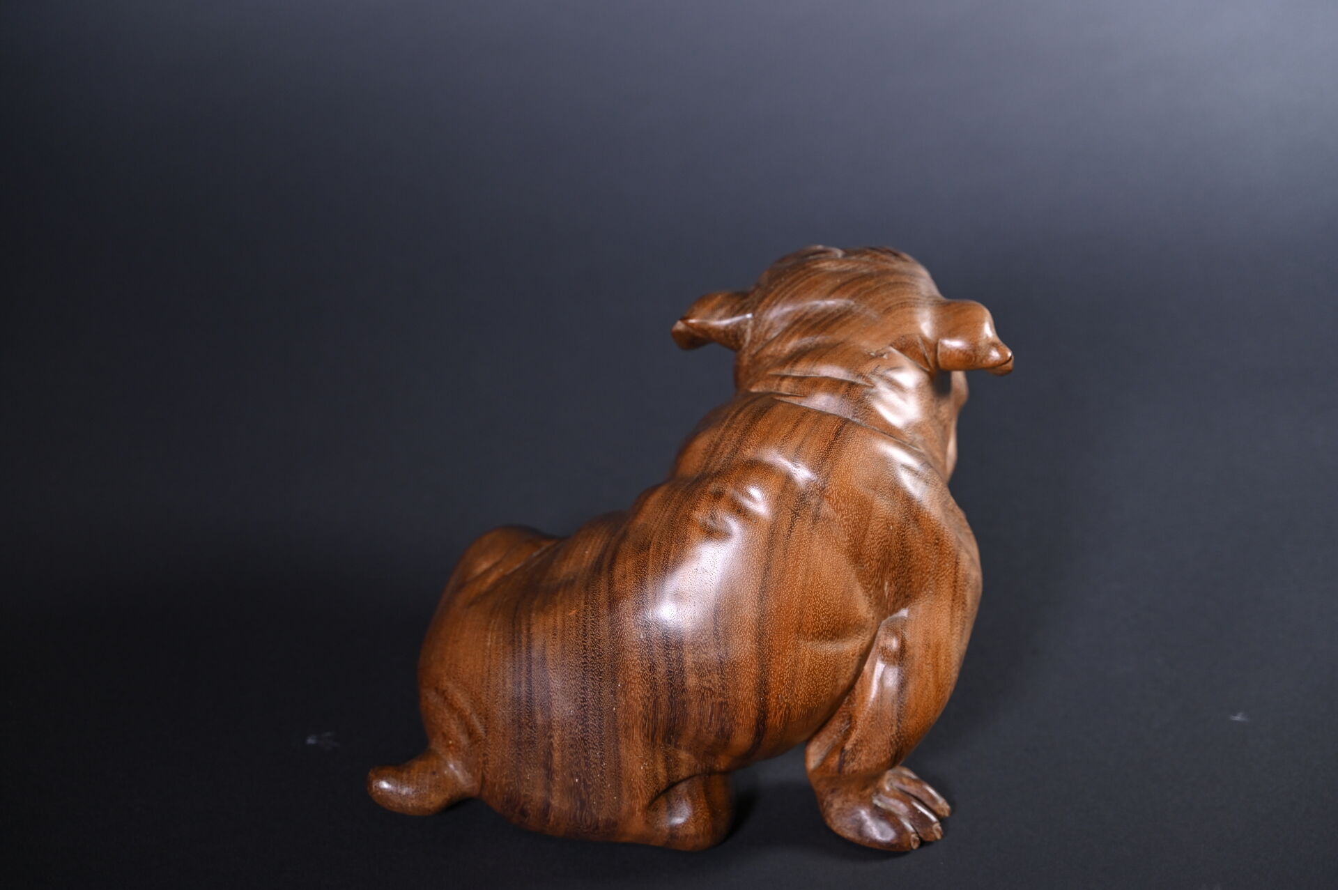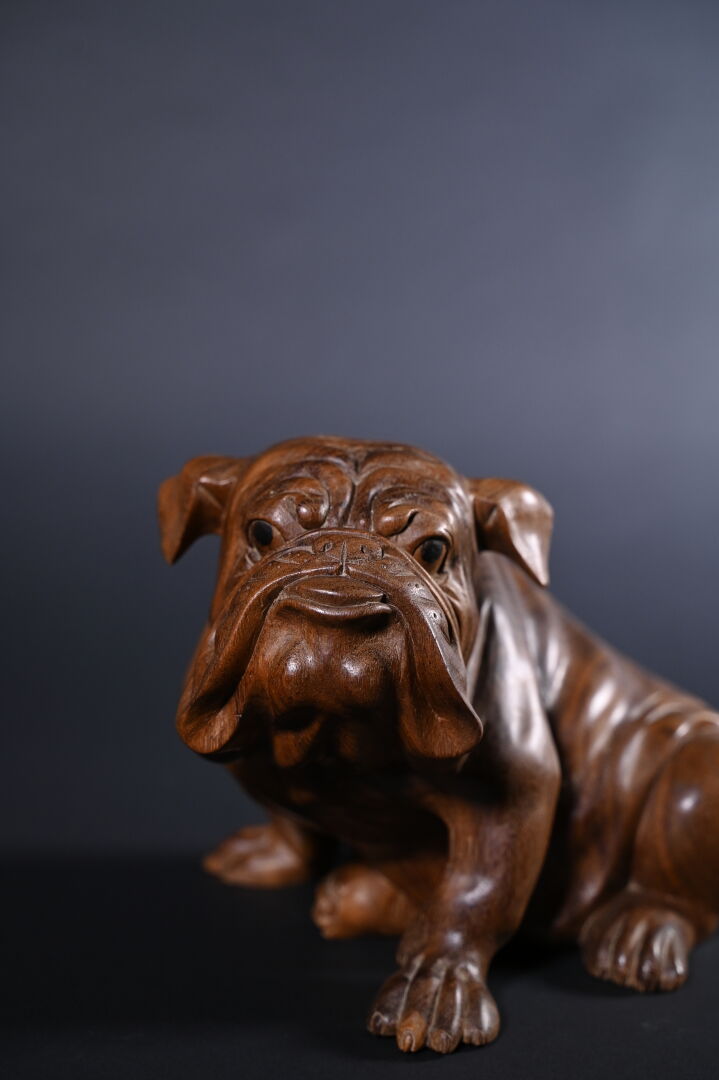 Bouledogue en bois exotique sculpté. XXe siècle. Haut. : 24 cm.