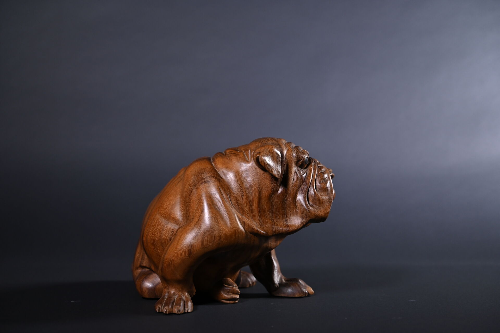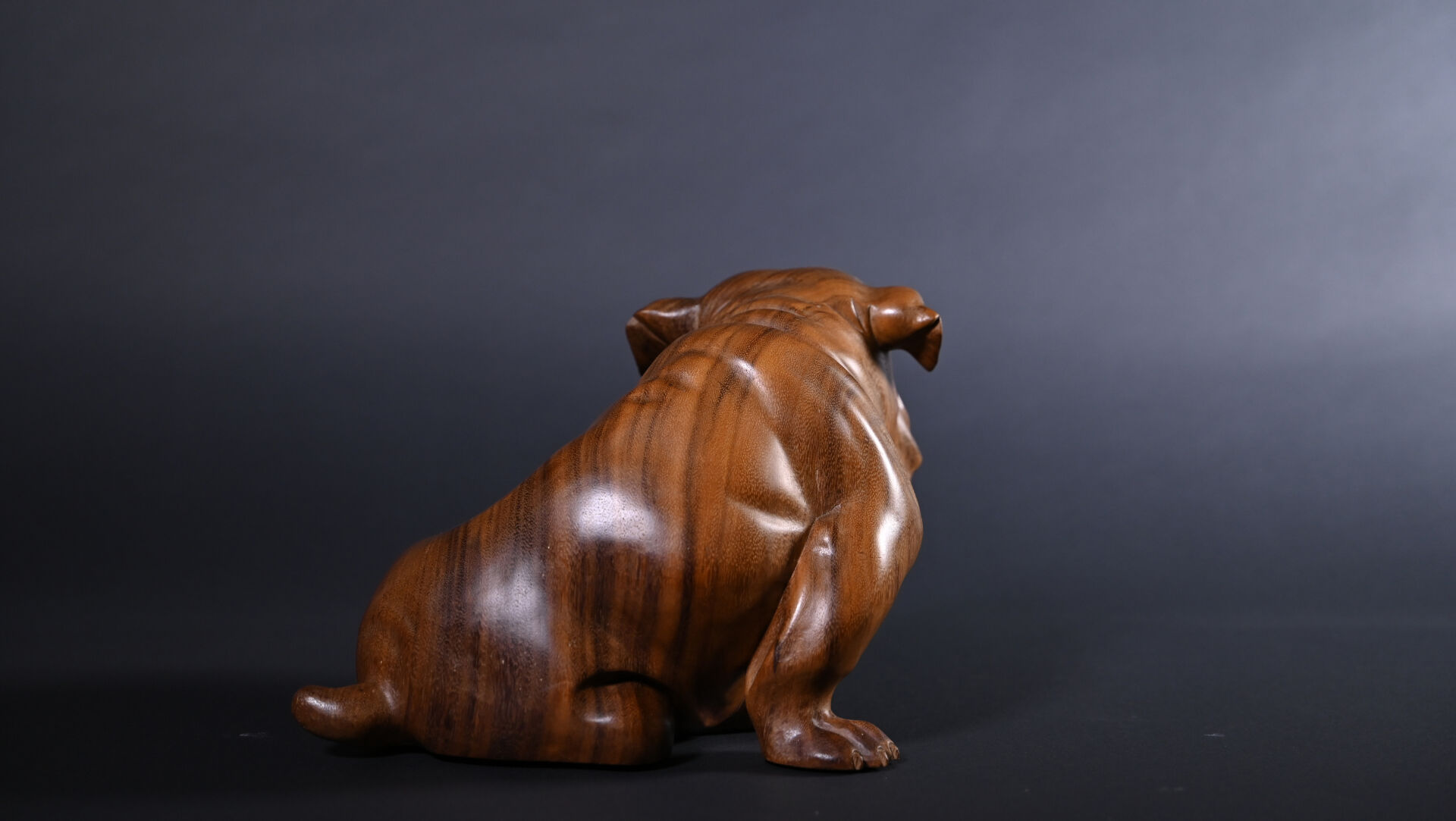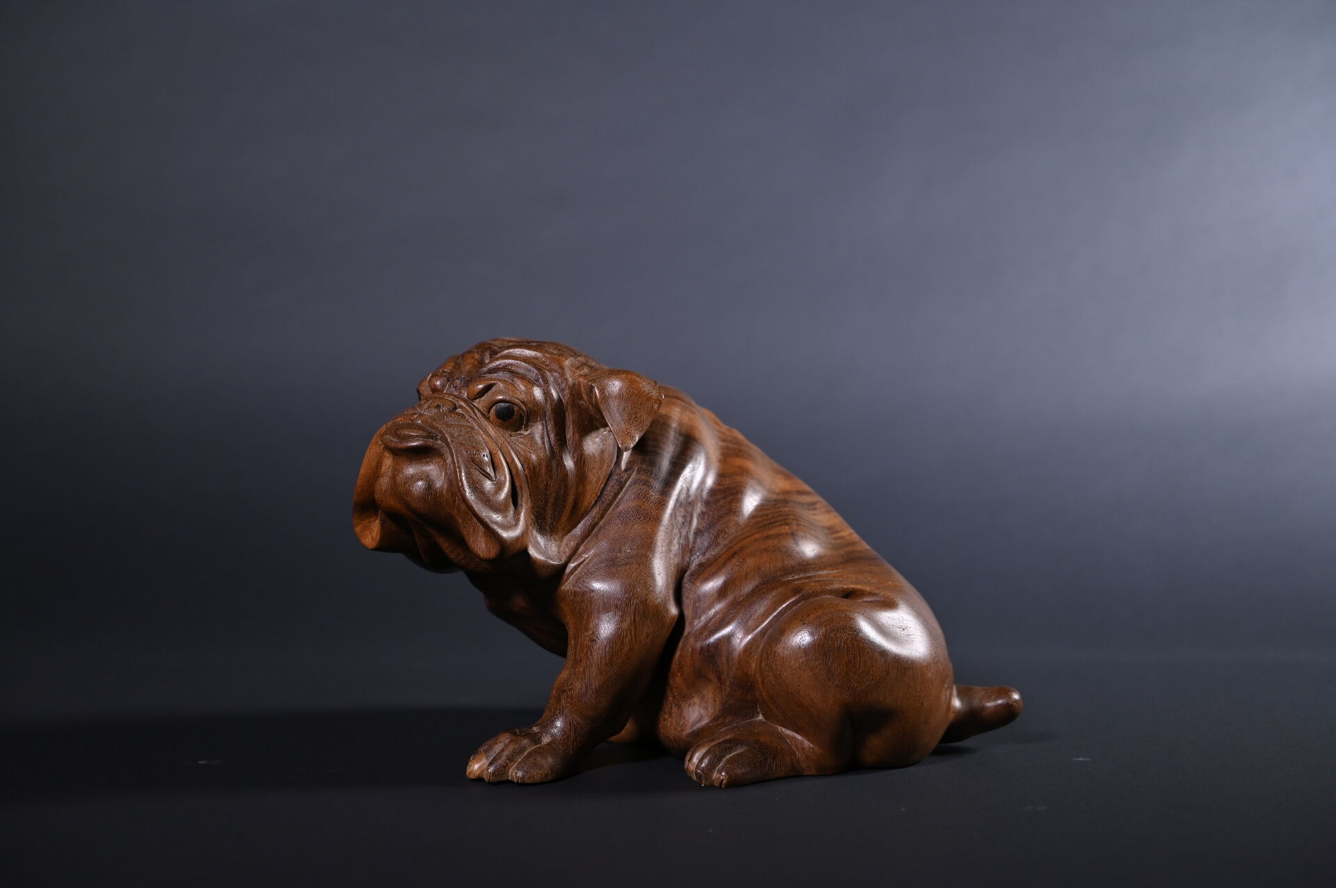 Bouledogue en bois exotique sculpté. XXe siècle. Haut. : 24 cm.
